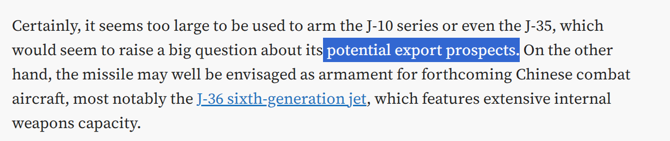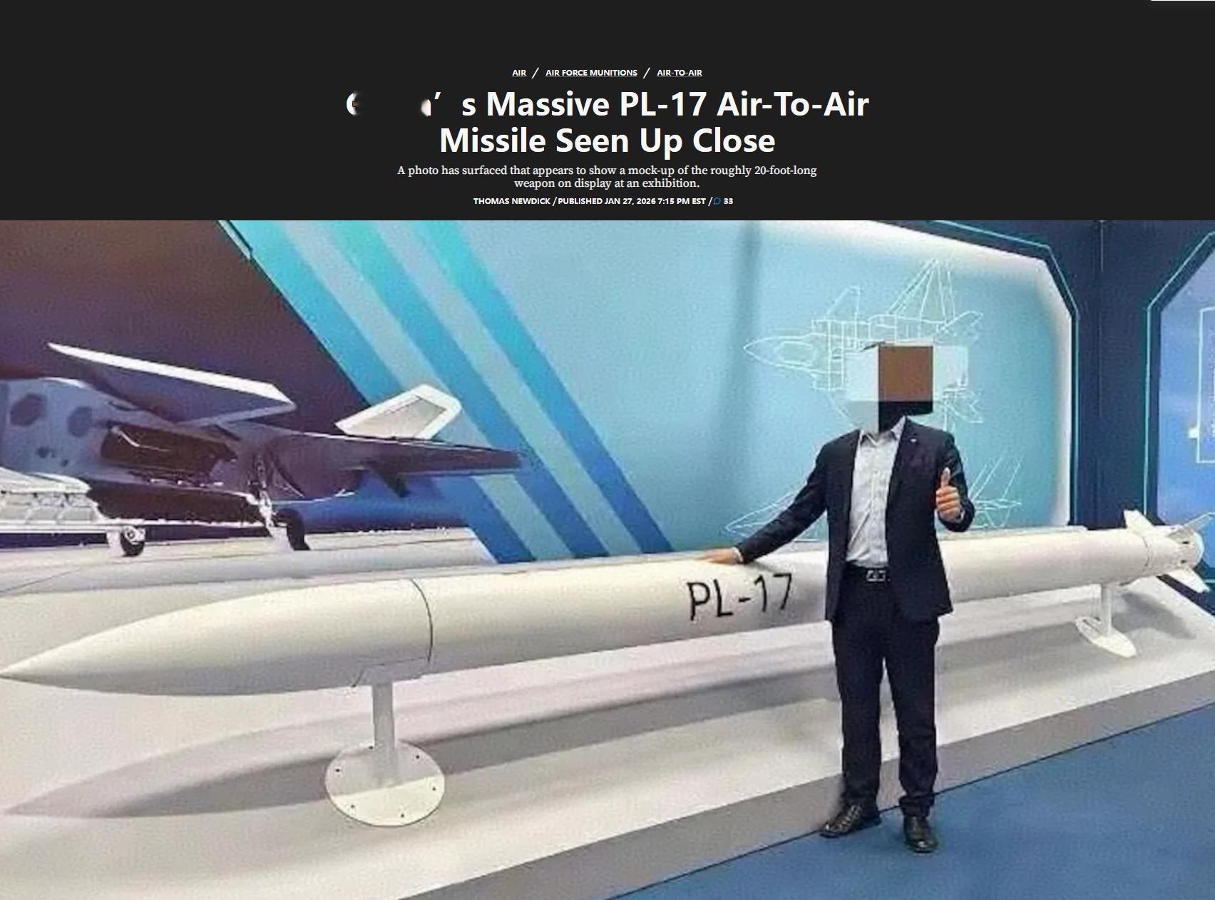 在定型快10年以后,TWZ这帮人终于发现了霹雳17.文章本身无所谓,我主要吐槽的是这句话:“显然,PL-17的尺寸似乎过大,无法装备歼-10系列甚至歼-35,这无疑对其出口前景提出了质疑。”不是兄弟,你真觉得这玩意儿会卖啊