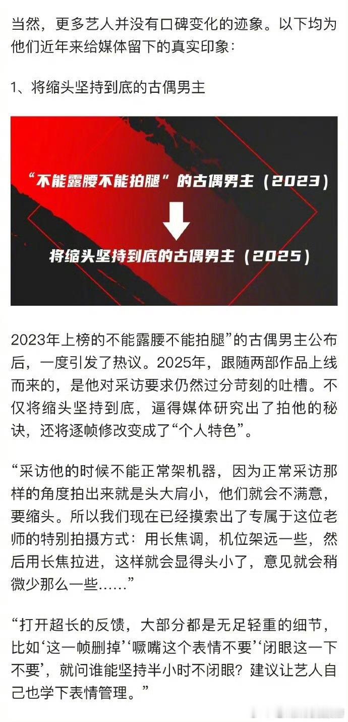 狐厂列出2025年三个黑榜艺人:1 将缩头坚持到底的古偶男主2 傲慢不尊重人的罢工姐3 贯彻“妈宝”风格的大男主