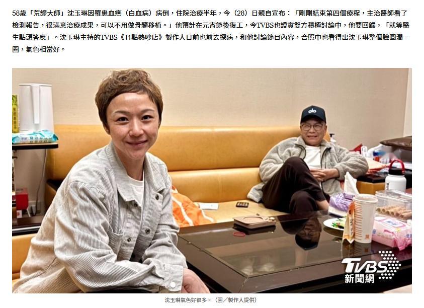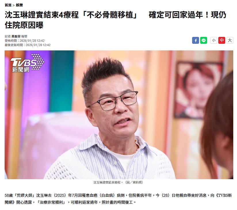 【沈玉琳预计元宵节后复工】沈玉琳说过年回家没问题 去年7月,58岁“荒谬大师”沈玉琳因罹患白血病病倒,之后住院治疗半年。1月28日,沈玉琳向TVBS新闻网开心透露,治疗非常顺利:“刚刚结束第4个疗程,主治医师看了检测报告,很满意治疗成果,可以不用做骨髓移植,所以回家过年应该没问题,推估复工时间是元宵节过后。”外界担心他的体力问题,会否考虑缩短一周主持的集数?沈玉琳直言:“如果复工就会是全面复工,血液疾病只要血球回复正常值就跟一般人没两样。”要大家放心。