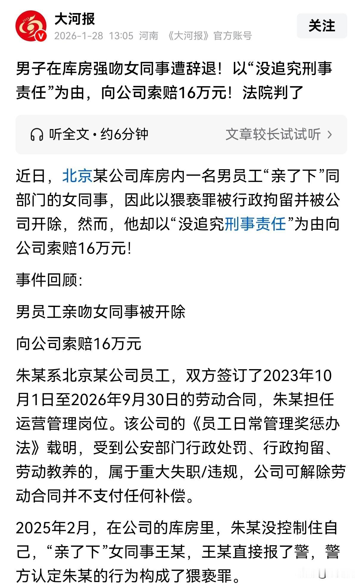 这就是胡来的代价!北京,男子见女下属年轻漂亮,趁着库房没有其他人,强吻了女下属,女下属勃然大怒,报了警,男子因猥亵他人被行政拘留5天。事后公司将男子开除,可男子不服,觉得自己没有被追究刑事责任,公司系违法解除劳动合同,要求公司支付16万经济赔偿金,可法院却给出了不同看法。 朱某在一家公司做运营管理岗位,他和公司签了3年的劳动合同,从2023年10月1日到2026年9月30日,这份工作薪资待遇都很不错,朱某也很满意。 一开始朱某很珍惜这份工作,兢兢业业,丝毫有任何懈怠。 后来朱某所在的部门来了一个年轻漂亮的女同事王某,王某是朱某的下属。 王某青春靓丽,朱某的内心泛起了阵阵涟漪。 2025年2月,朱某和王某单独在公司库房,他见四下无人,觉得机会来了,故意靠近王某,趁着王某不注意,强吻了她。 王某被朱某突然的举动吓懵了,脸也瞬间涨得通红,她大声斥责朱某要干什么。 朱某却一脸无所谓的样子,嬉皮笑脸的解释说自己就是不小心亲了一下,没什么大不了的,还让王某不要这么小题大做。 王某气得浑身发抖,她知道自己和这种无赖多说无益,直接报了警。 事发后,朱某因猥亵他人被行政拘留5天,这5天里,朱某在拘留所里后悔不已,他没想到自己一时冲动会带来如此严重的后果。 朱某出来后,正常上班,可2025年5月,公司突然找他谈话,原来公司接到举报,说朱某因猥亵女同事,被行政拘留过,按照公司的奖惩制度,公司应当将朱某开除。 公司的《员工日常管理奖惩办法》中明确载明:受到公安部门行政处罚、行政拘留、劳动教养等,属于重大失职/违规,公司可解除劳动合同并不支付任何补偿。 得知公司要将自己开除后,朱某解释,他只是和王某开了个玩笑,亲了一下她,自己已经受到了惩罚,被拘留5天,但是自己又没被追究刑事责任,公司凭什么将自己开除。 公司觉得朱某猥亵他人的行为,确实严重违反了公司制度,造成了不好的影响,坚持跟他解除了劳动合同。 朱某认为公司跟他解除劳动合同系违法解除,要求公司支付16万经济赔偿金。 申请劳动仲裁无果后,他一纸诉状将公司告上了法庭。 法院审理后认为朱某确实存在因违法行为被拘留的事实,属于严重违反公司规章制度的行为。 《劳动合同法》第39条第2款规定:劳动者严重违反用人单位的规章制度的,用人单位可以解除劳动合同。 法院判定公司与朱某解除劳动合同并无不妥,系合法解除,最终驳回了朱某的诉求。 对于这个结果,朱某估计也是后悔莫及的,他没想到自己冲动一下,就把一份高薪工作给弄丢了,还落得一个声名狼藉的下场。 有人说,这是何必呢,就这么控制不住自己吗?这真是赔了夫人又折兵。就算公司不开除,估计也没脸呆了。 朱某的行为实在是太不应该了,职场是一个工作的地方,不是他满足个人私欲的场所,他的行为不仅伤害了王某,也让自己失去了工作和声誉。 这场闹剧最终以朱某的败诉而告终,这也给那些心怀不轨的人敲响了警钟:在职场中,一定要遵守道德和法律准则,否则必将自食恶果。 我们要尊重每一位同事,无论他们的性别、年龄和外貌如何,不能因为一时的冲动而做出不恰当的行为,否则将会付出沉重的代价。