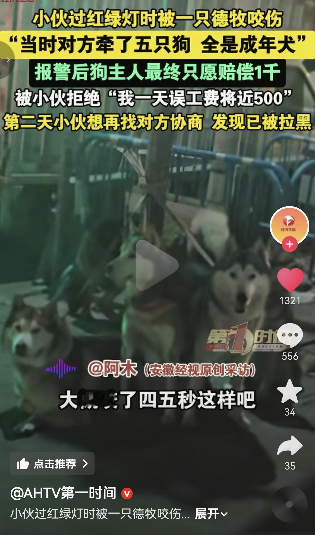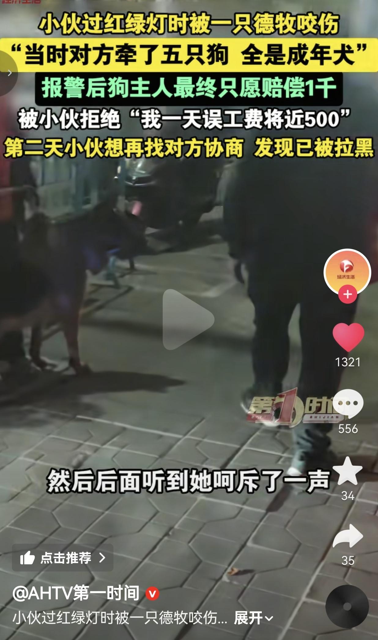 这种没有道德和素质的养狗人绝不姑息!深圳一男子下班后,像往常一样过红绿灯,突然,一只德牧猛地向他扑了过来,狠狠咬住了他的腿。 狗主人意识到自己的狗咬人了,这才呵斥着狗,狗才松开嘴吧。可是,他的腿上已经布满了血痕,甚至,裤子也被咬出了破洞。 更让人心寒的是,狗主人是一个女生,她手里一共牵着五只成年,一只德牧,四只哈士奇。这么多大型犬,真的牵得过来吗? 事发后,狗主人的态度让人感到心寒,当时只有狗主人的朋友垫付了第一针疫苗的钱,狗主人硬是一分钱都没出。 为了解决问题,他第一时间选择了报警,一开始狗主人只愿意赔偿500块钱。后经过警方调解,他也愿意赔偿1000块钱。 听到女子的话后,小伙子当场就拒绝了:“我一天的误工费都快500了,这点钱连打针都不够,更别说我的误工费了!” 小伙子也不愿意把事情闹大,第二天,他思虑再三,原本还想和对方好好协商一下,结果却发现自己已经被对方拉黑了。 更让他无语的是,对方最后还丢下一句:“你去起诉我吧。” 如今,他只能等待着去验伤,准备走法律程序来维护自己的权益。 网友看到后评论说:“你喜欢养宠物,那你就养,因为,养宠物是你的自由,但别把自由建立在别人的危险之上!” 也有的网友说:“见过遛两三只狗的,五只大型犬一起,这狗主人心也太大了,难道她不知道这潜在的危险吗?” 我们都知道养大型犬出门牵绳、戴嘴套,这是基本的法律规定,更是对他人安全的尊重。 你也不想一想?你一个人牵五只成年犬遛狗,这本身就是对他人存在一种极大的安全隐患。 而且,咬伤人后,她最该做的是积极道歉、承担责任,而不是用1000块钱想“草草了事”。 甚至为了逃避责任,干脆拉黑消失,还放话让对方去起诉。这种逃避的态度,比在伤口上撒盐更让人寒心。 我们总说“狗是人类的朋友”,但前提是主人要尽到应尽的责任。文明养犬从来不是一句口号,它关系到每一个路人的安全感。今天是这个小伙子被咬伤,明天可能就是你我。所以,遇到这种行为,绝不能姑息,必须要让狗主人受到法律应有的惩罚。 (信息来源:AHTV第一时间)