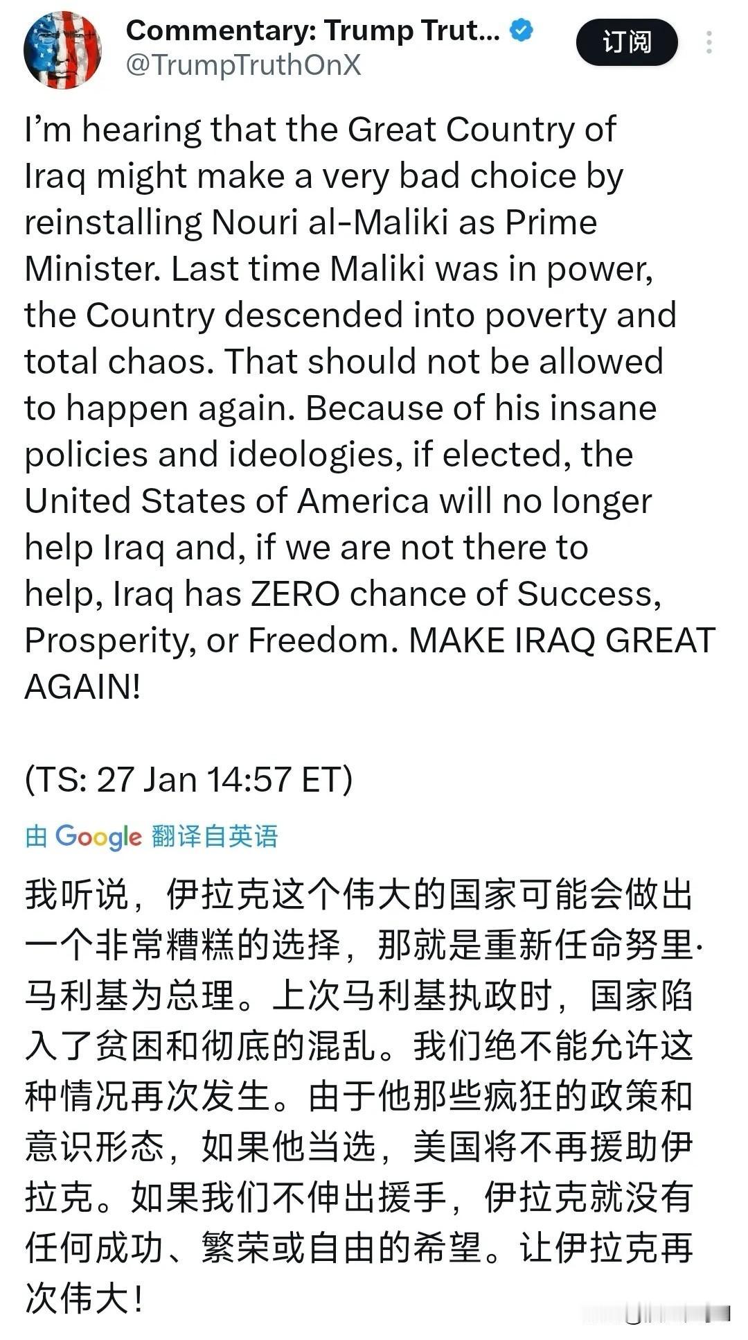 特朗普搅和伊拉克总理任命 放话断援耍横 特朗普发文搅和伊拉克总理任命一事。 北京时间1月28日特朗普在社交平台发文,针对伊拉克总理人选问题指手画脚,直言伊拉克若重新任命马利基为总理是糟糕选择,指责马利基执政期间让伊拉克陷入贫困混乱,放话其当选美国就彻底中断对伊援助。他还称无美国援助,伊拉克就没成功繁荣自由的可能,最后还喊出要让伊拉克再次伟大的话。1月24日伊拉克新一届国民议会最大党团,已正式提名马利基为新任总理人选。 特朗普的真实心思根本不在伊拉克发展上,马利基亲伊朗的立场,碰了美国在中东的霸权蛋糕。美国将对伊援助化作拿捏他国的工具,特朗普拿断援相逼,就是直白干涉伊拉克的选举主权,逼着伊拉克在美伊之间选边站队。所谓的美国援手,不过是谋中东私利的幌子,其喊出的口号更是虚头巴脑的表面功夫,这番操作彻底露了美国霸权干涉他国内政的底。 特朗普这波耍横的背后 伊拉克将如何选择?评论区来聊聊。