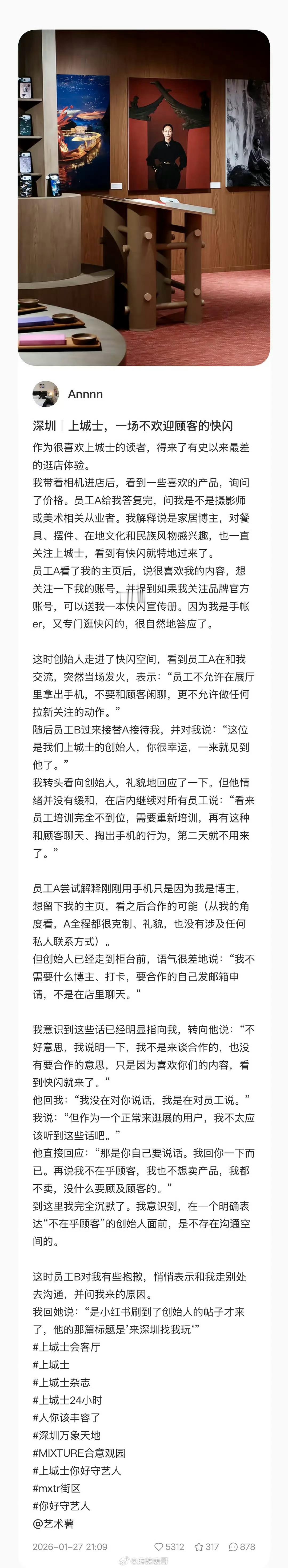 《上城士》做快闪,说欢迎大家去,有人去了后却被创始人伦思博怼了,说不需要人去打卡