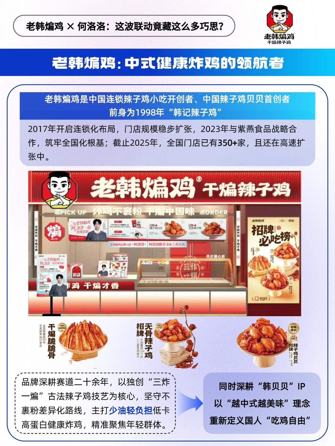 ✅作为中式炸鸡领军品牌,老韩煸鸡深耕赛道近[三R][零R]年,凭独创“三炸一煸”古法辣子鸡技艺牢筑差异化壁垒,主打炸鸡不裹粉、低卡高蛋白的健康路线,再靠“韩贝贝”IP精准贴合年轻人审美,妥妥站稳中式炸鸡领航者位置。