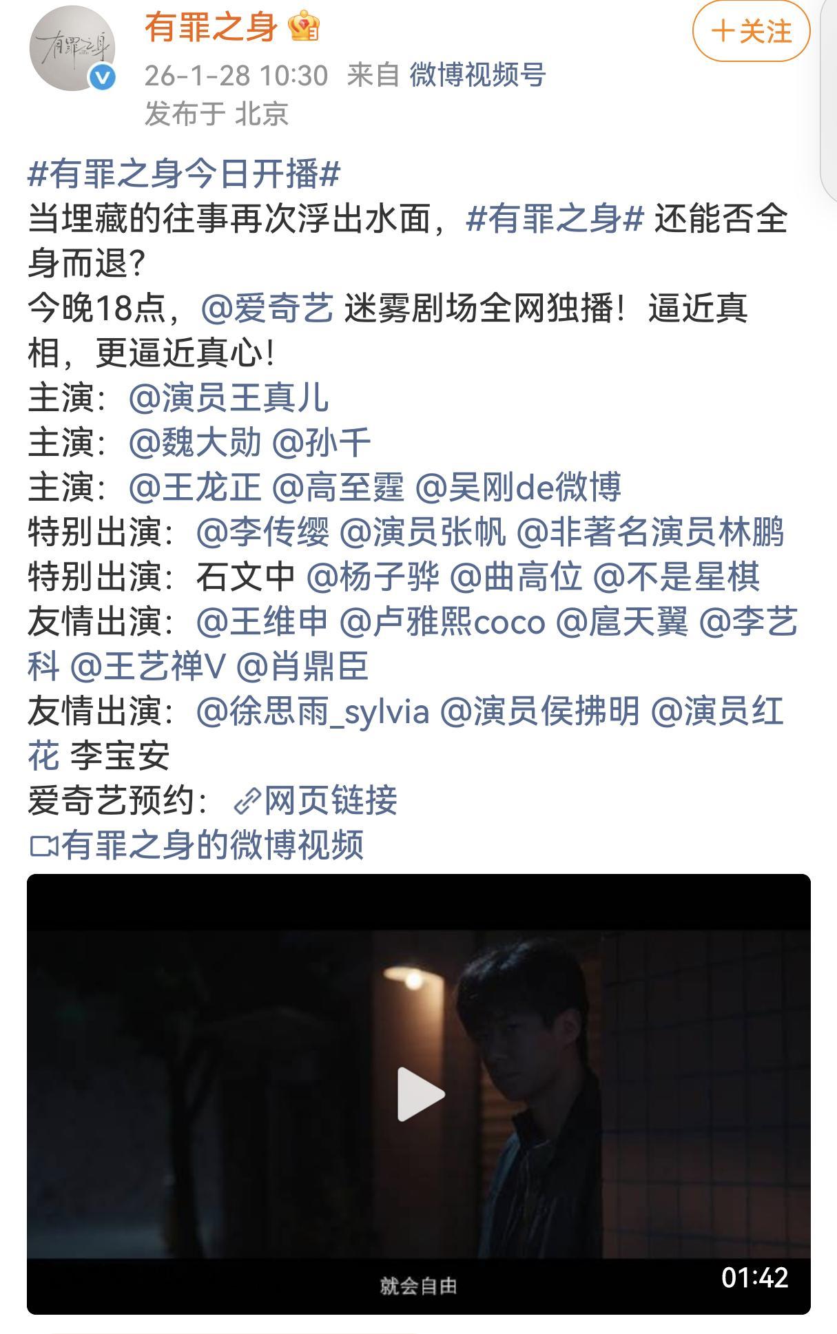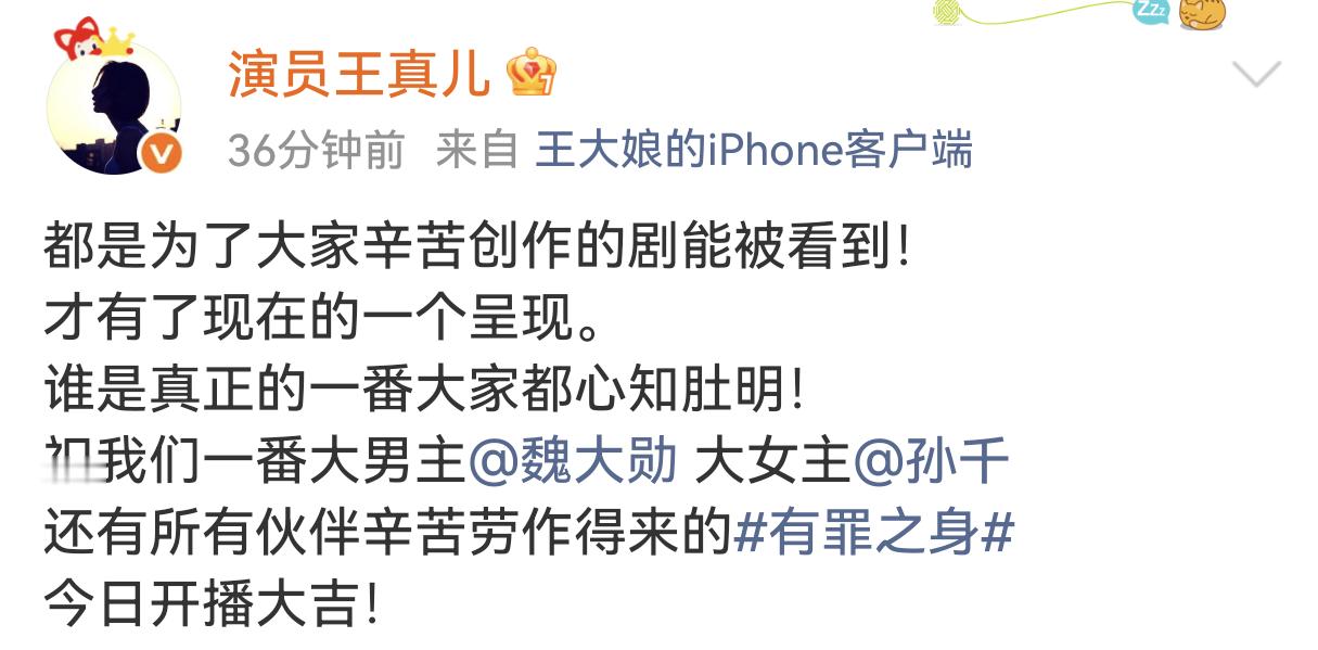 演员王真儿回应在《有罪之身》中王真儿压番魏大勋孙千 争议:“都是为了大家辛苦创作的剧能被看到!才有了现在的一个呈现。谁是真正的一番大家都心知肚明!祝我们一番大男主大女主还有所有伙伴辛苦劳作得来的有罪之身 今日开播大吉! ”王真儿友情主演变一番