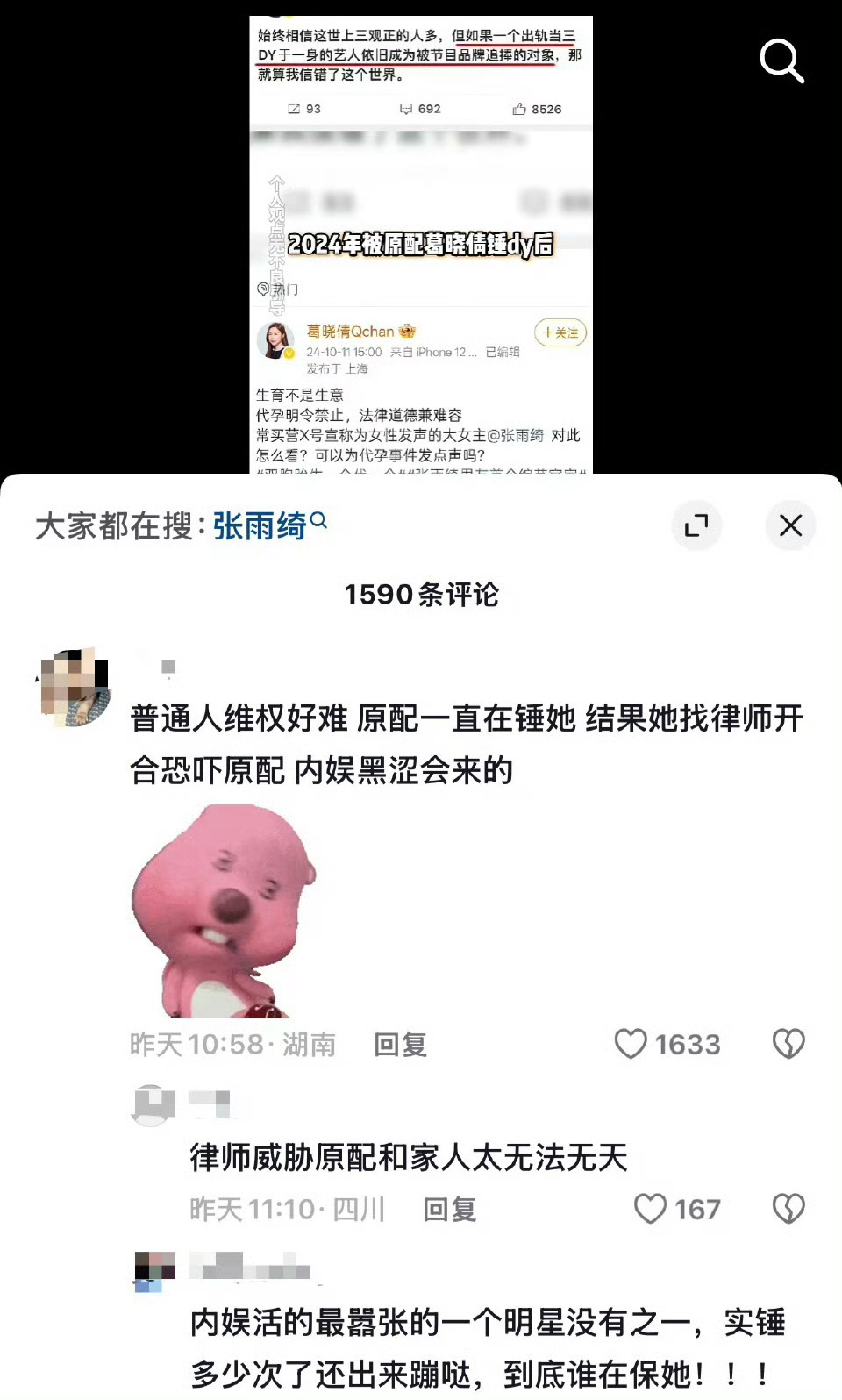 张先是插足余某和王某的感情,导致余某流产,和王某结婚离婚后又插足葛女士和袁巴元的感情,还曝光葛女士和袁巴元的孩子,逼的孩子多次转学,和袁巴元离婚后又同居,又被袁巴元锤和别的男人开房,她两个双胞胎一代一孕,被曝光后利用自己的资源威胁曝光她代孕的人,这种劣迹斑斑的艺人早该被封杀!张雨绮袁巴元至少打了三次架张雨绮不能用回避代替真相