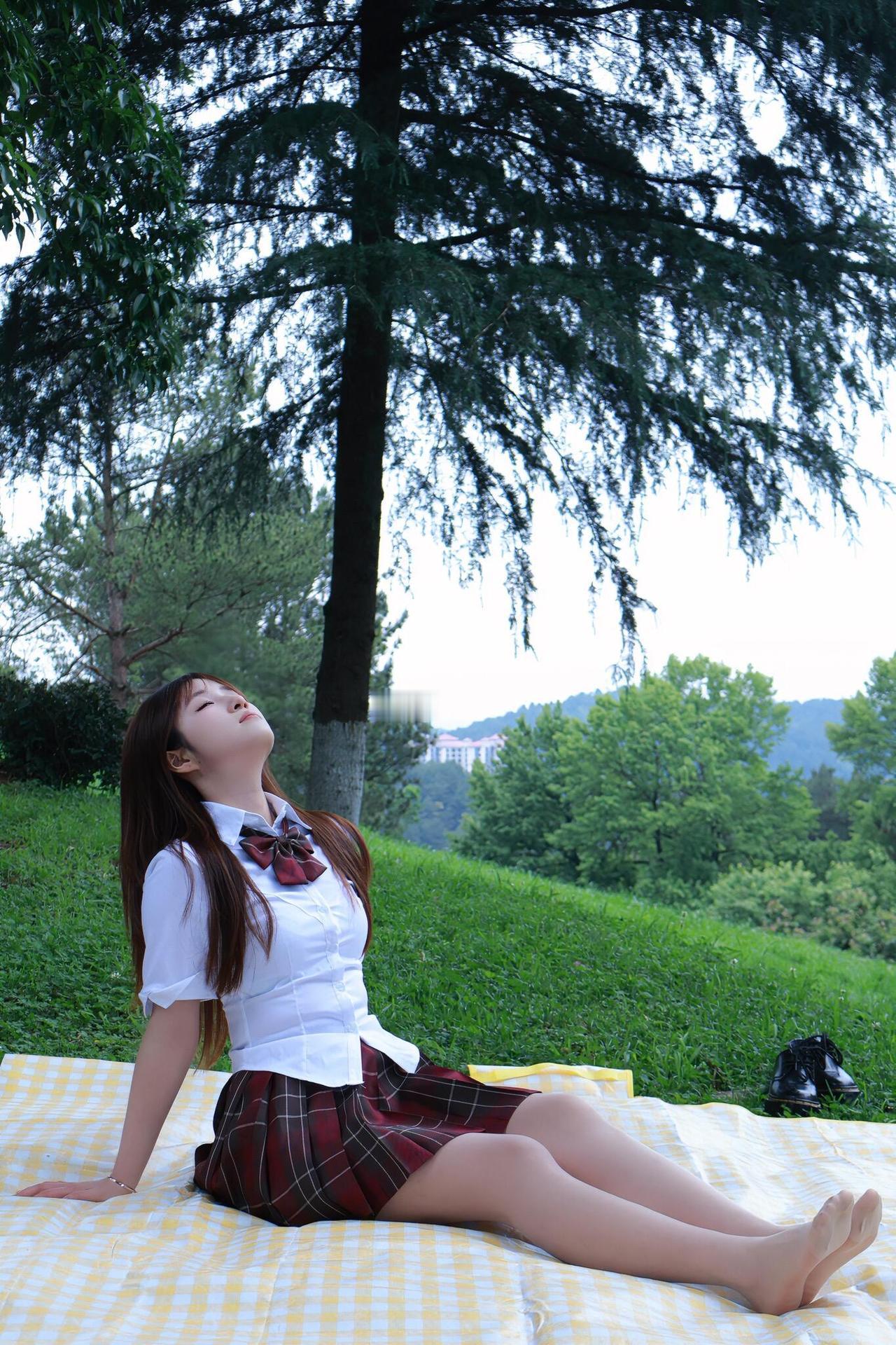 jk女孩穿超薄加固丝袜趴在草坪上,也太惬意了,真美!jk袜穿搭 女短丝袜 女半脚尖袜