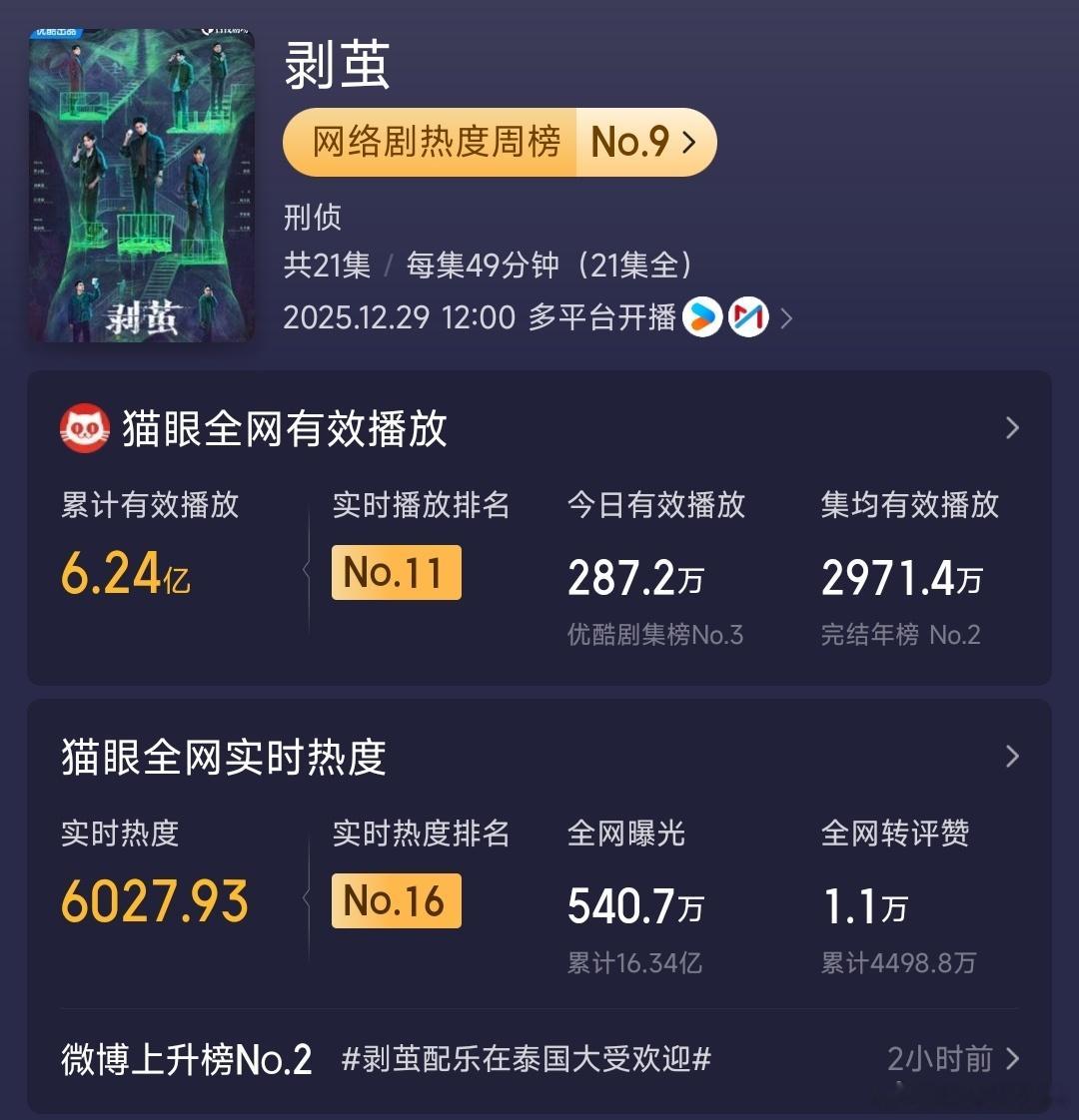 今日《剥茧》传来三件喜讯。一是《剥茧》配乐在泰国大受欢迎,此前《剥茧》就因硬核本格推理,曼谷全城为其点亮一周,再往前,《水龙吟》也是全球辞爆,罗云熙以人带剧的超强IP能力名副其实,每部作品都能引领中国文化海外输出。二是26部电视剧网络剧列入重点作品版权保护预警名单有《剥茧》的身影,入选该名单就说明被国家盖章,在品质、市场表现力和演员能力上给予了认可,这是先因后果的关系,换言之,有了《剥茧》的过硬质量,才有国家的背书,罗云熙出品,必属精品再次被印证。三是《剥茧》的集均达到了2972万,作为一部几乎零宣发的悬疑剧,《剥茧》以黑马之姿逆流而上,一挽生活流悬疑的颓势,让大众重拾对悬疑剧的信心,挽狂澜于将倾,扶大厦于既倒,完结后依然实现逆增长,足见长尾效应。回首《剥茧》,洛丽塔疑云惊艳开篇,漏斗蛛谜案直接封神,错位人生探讨教育,危险保单直视现实,消失的油画解构人性,原罪串联所有,与开头呼应,整体节奏紧凑、信息密度高,核心看点、镜头语言、叙事结构、角色塑造、氛围与细节各方面都属上品,如此优秀,观众不请自来。第二季,安排上,罗云熙,下一程见。剥茧跨年电影愿