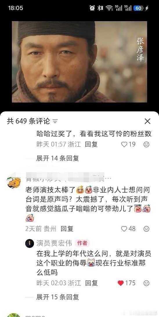 太平年中饰演张彦泽的演员贾宏伟说:“不能原声台词是对演员这个职业的侮辱,现在行业标准这么低吗?”想起那个正片里面拿剧本的演员,粉丝还吹他演技好