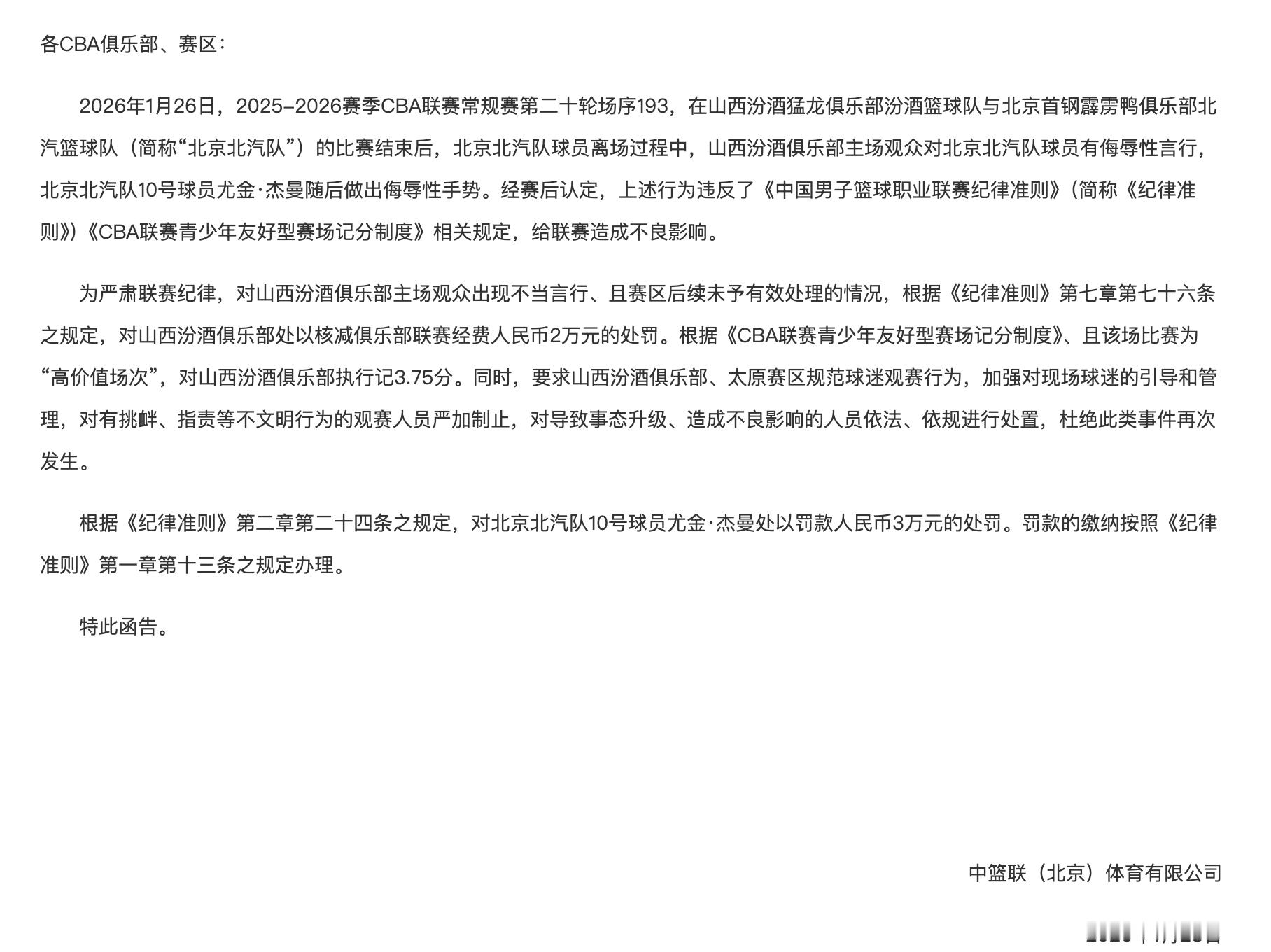 山西汾酒俱乐部、北京队外援杰曼被处罚cba