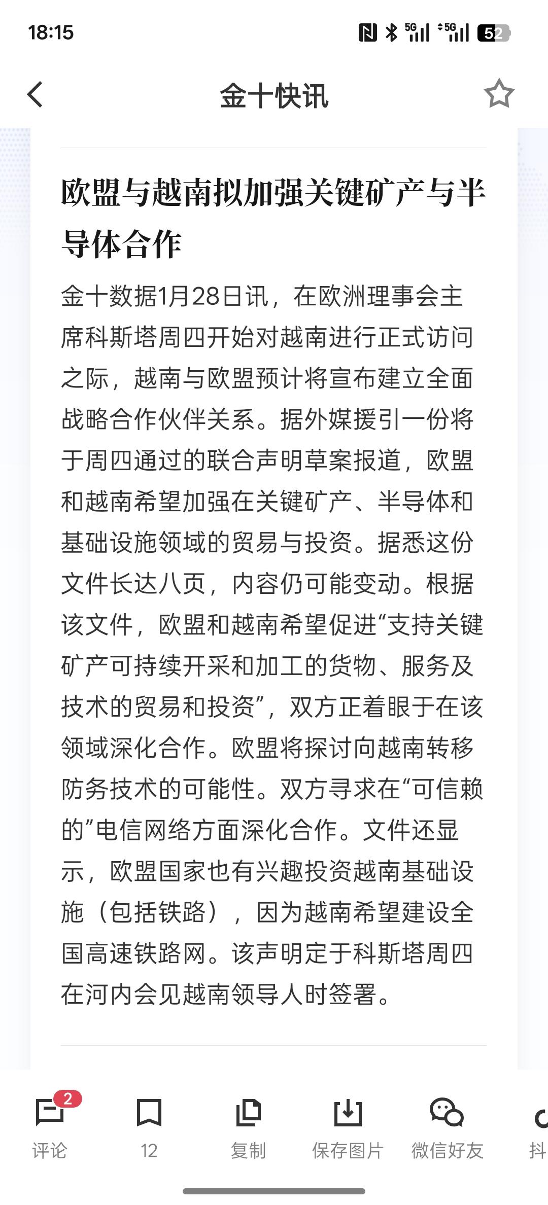 欧盟与越南拟加强关键矿产与半导体合作,看来,全球半导体行业正在发生变化,而欧盟也在加速发展半导体领域的合作方式!主要是因为AI人工智能快速的发展,全球对芯片半导体的需求量大幅增加,有很多国家开始发展属于自己的芯片,半导体主要是因为美国对中国在芯片半导体领域的打压,也让很多国家看到了芯片半导体自主发展的重要性!