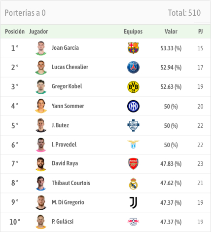 🙌胡安·加西亚是五大联赛所有门将中零封率最高的,达到 53.33%。 紧随其后的是卢卡斯·舍瓦利埃(巴黎圣日耳曼)和格雷戈尔·科佩尔(多特蒙德),零封率分别为 52.94% 和 52.63%。巴萨vs哥本哈根巴萨欧冠联赛