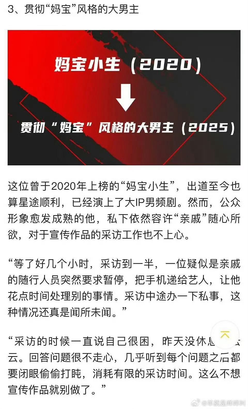 1.不能露腰不能拍腿的古偶男主转变为将缩头坚持到底的古偶男主2.高片酬糊弄姐转为傲慢不尊重人的罢工姐3.妈宝小生转为贯彻妈宝风格的大男主一个没猜出来…2025搜狐黑榜艺人
