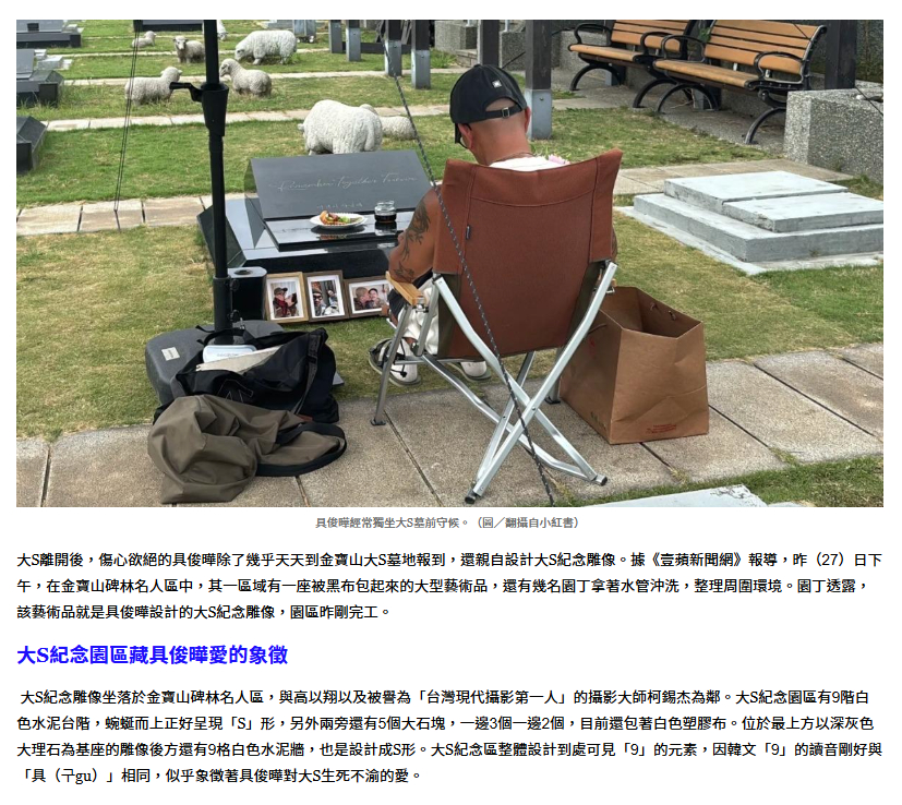 【具俊晔给大S设计的纪念雕像完工】大S纪念雕像已完成 据台媒报道,大S逝世一周年之际,由具俊晔设计的大S纪念雕像已顺利完成,预计将在2月2日大S逝世一周年当天揭幕。1月27日下午,在金宝山碑林名人区中,有一座被黑布包起来的大型艺术品,还有几名园丁拿着水管冲洗,整理周围环境。园丁透露,该艺术品就是具俊晔设计的大S纪念雕像。大S纪念园区有9阶白色水泥台阶,蜿蜒而上正好呈现S形,另外两旁有五个大石块,一边三个一边两个。位于最上方的以深灰色大理石为基座的雕像后方还有9格白色水泥墙,也是设计成S形。大S纪念区整体设计到处可见“9”的元素,因韩文“9”的读音刚好与“具”相同,似乎象征着具俊晔对大S的思念与牵挂。(TVBS新闻网)