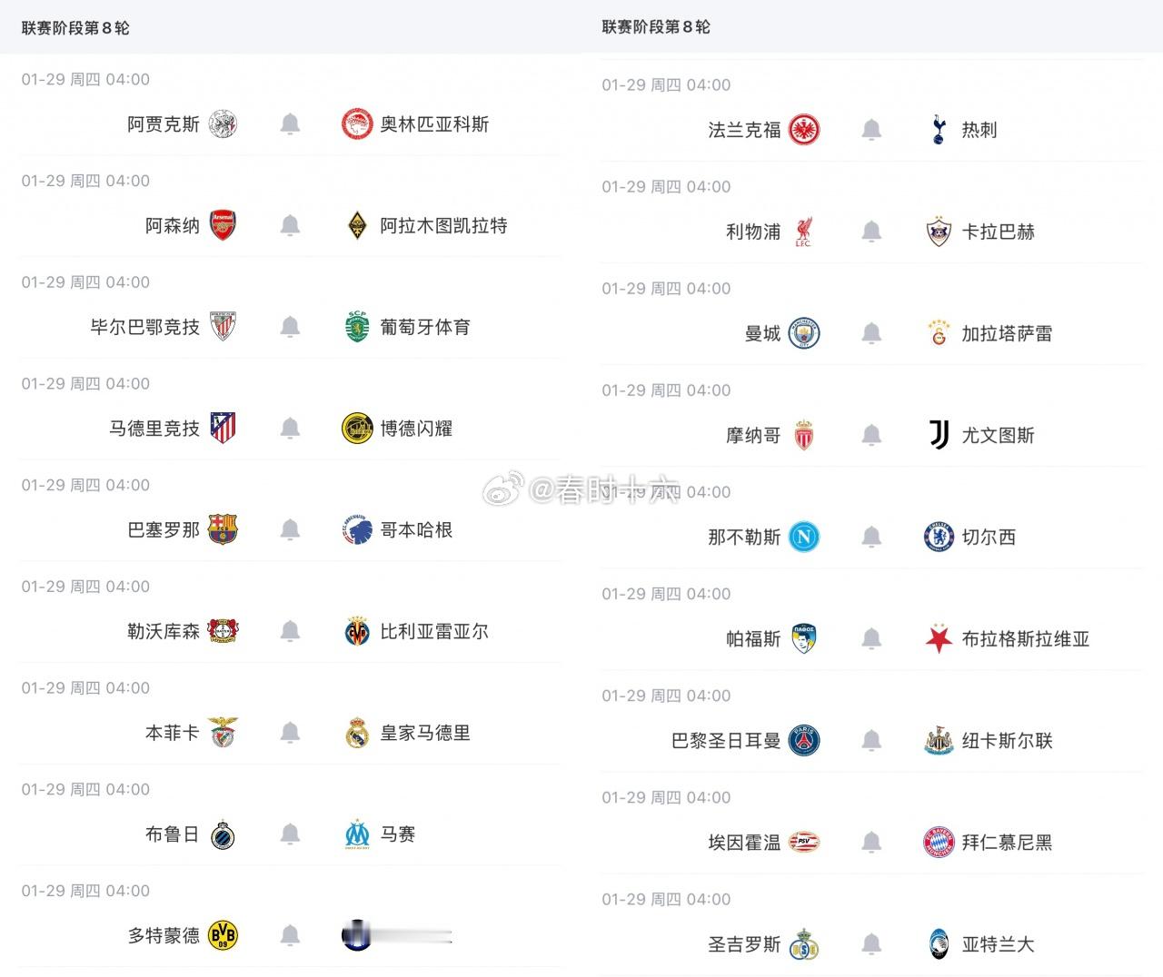 欧冠春晚提前看!4点末轮18场打响:6个直通名额待定 8队同积13分欧冠 01月28日讯 北京时间明天凌晨4点,欧冠联赛阶段末轮,18场比赛将同时打响!欧冠前7轮战罢,36支球队仅有阿森纳和拜仁锁定了直通16强的名额,4队确定无缘淘汰赛。目前在欧冠积分榜上,有多达8支球队同积13分,末轮将为了仅剩的6个直通16强名额厮杀。而欧冠排名规则为同分情况下先看净胜球,末轮各队或许将会上演进球大战!已确认晋级16强阿森纳、拜仁慕尼黑已确认晋级16强或淘汰赛附加赛亚特兰大、马德里竞技、巴塞罗那、切尔西、国际米兰、尤文图斯、利物浦、曼城、纽卡斯尔、巴黎圣日耳曼、皇家马德里、葡萄牙体育、托特纳姆热刺已淘汰法兰克福、阿拉木图凯拉特、布拉格斯拉维亚、比利亚雷亚尔欧冠联赛阶段末轮完整赛程