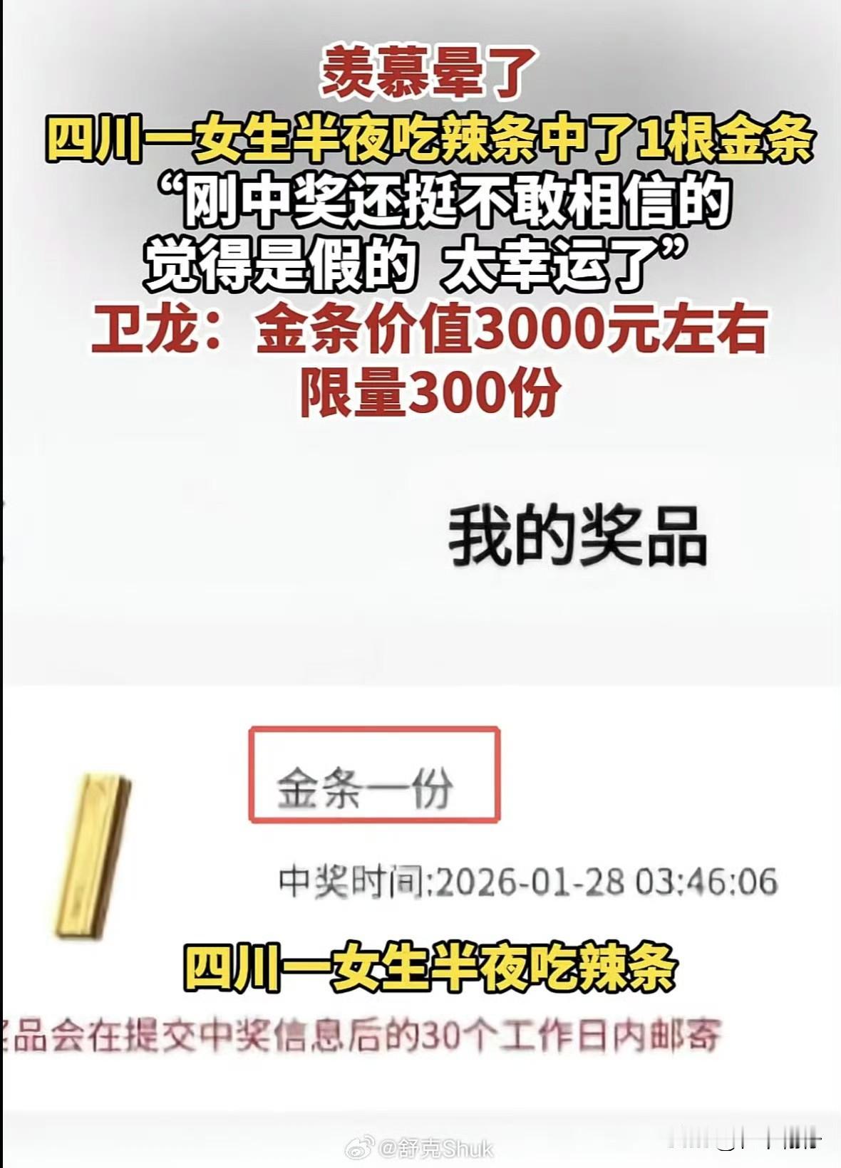 四川一名女子在超市购买了一包三十多元的辣条零食礼包,深夜打开食用时,发现包装内的抽奖卡片显示中得金条。起初她怀疑真实性,但经过品牌客服确认后,她已提交地址等待邮寄。不少人感叹:“我吃的辣条都够买金条了,却从没中过。”一边羡慕她的好运,一边也乐于“沾沾喜气”。 这样的运气就像买彩票,我们总是乐于见证它的发生——因为它证明世界依然存在惊喜,却很少预期它会降临在自己身上。这种“沾喜气”式的围观,成了一种轻量的情绪参与和乐趣来源。 当然,购买商品首先应基于需要与喜好,而非追逐大奖。但不得不说,这次事件既让一位消费者收获惊喜,也完成了一次成功的品牌营销——在平凡日常里,偶然点亮一丝金光,就足以被人记住,并传递开来。