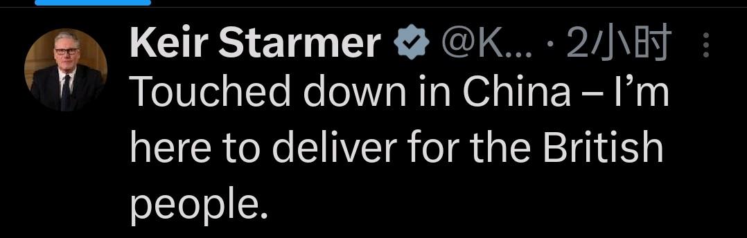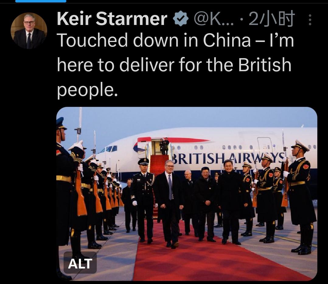 新闻快讯——【英国首相斯塔默抵达中国 开启首次正式访华】 当地时间2026年1月27日,英国首相基尔·斯塔默抵达中国,开启其任内首次对华正式访问。他在社交平台发文称,此行旨在“为英国民众争取切实利益”。 抵达时,中方为其举行了隆重的红毯欢迎仪式。此次访问聚焦中英贸易、气候变化及全球安全等议题,是近年来中英高层互动的重要事件,备受国际关注。