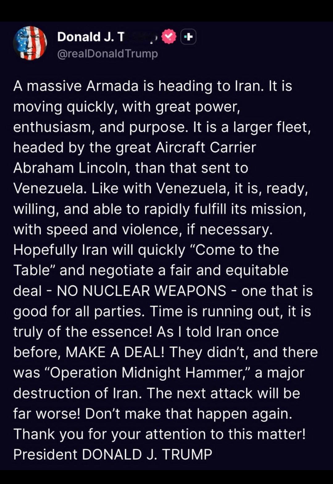 新闻快讯——【特朗普发文称美军庞大舰队驶向伊朗 警告新一轮打击将更猛烈】 当地时间2026年1月27日,美国总统唐纳德·特朗普在其社交平台Truth Social发文称,以“亚伯拉罕·林肯”号航母为核心的庞大舰队正快速驶向伊朗,该舰队规模超过此前派往委内瑞拉的兵力,已准备好必要时以“迅猛且强硬的方式”完成任务。 特朗普在文中敦促伊朗尽快重返谈判桌,达成一项禁止发展核武器的公平协议,并警告称,若伊朗拒绝,新一轮打击将比2025年6月摧毁伊朗核设施的“午夜之锤”行动更为猛烈。