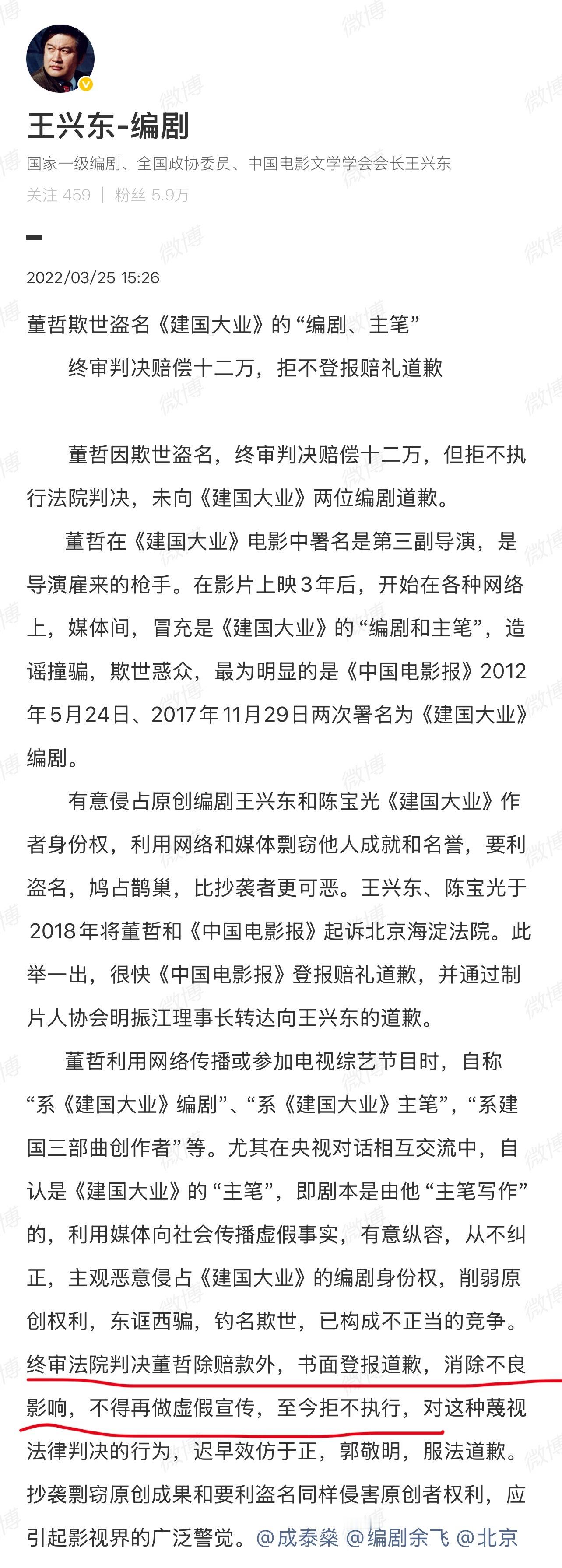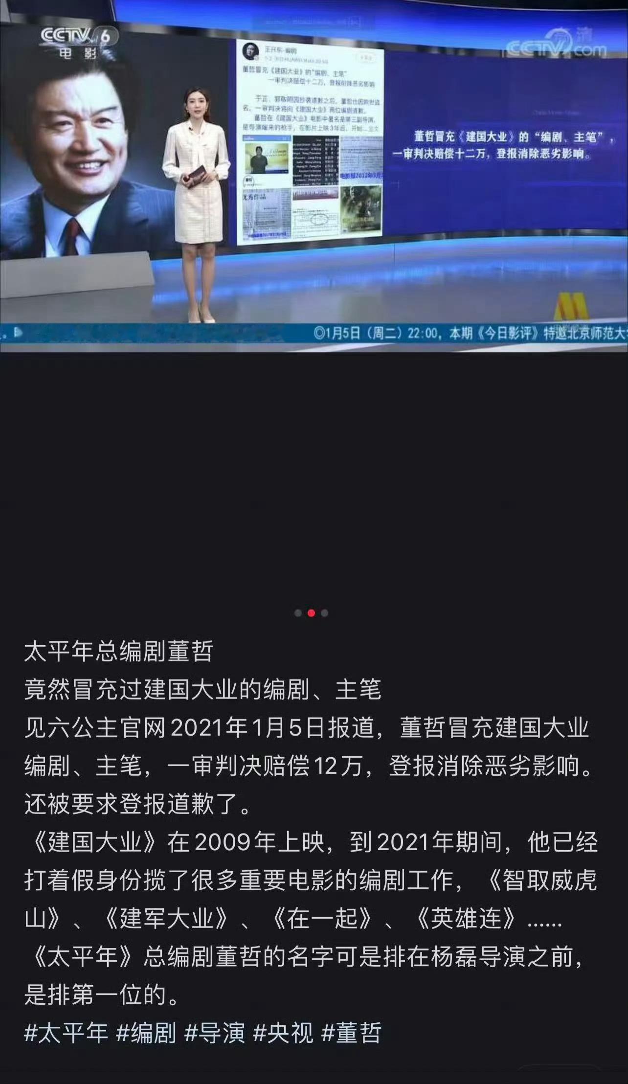 吃瓜吃到太平年的总编剧董哲曾因冒充建国大业的编剧被判12万,还被要求登报道歉。