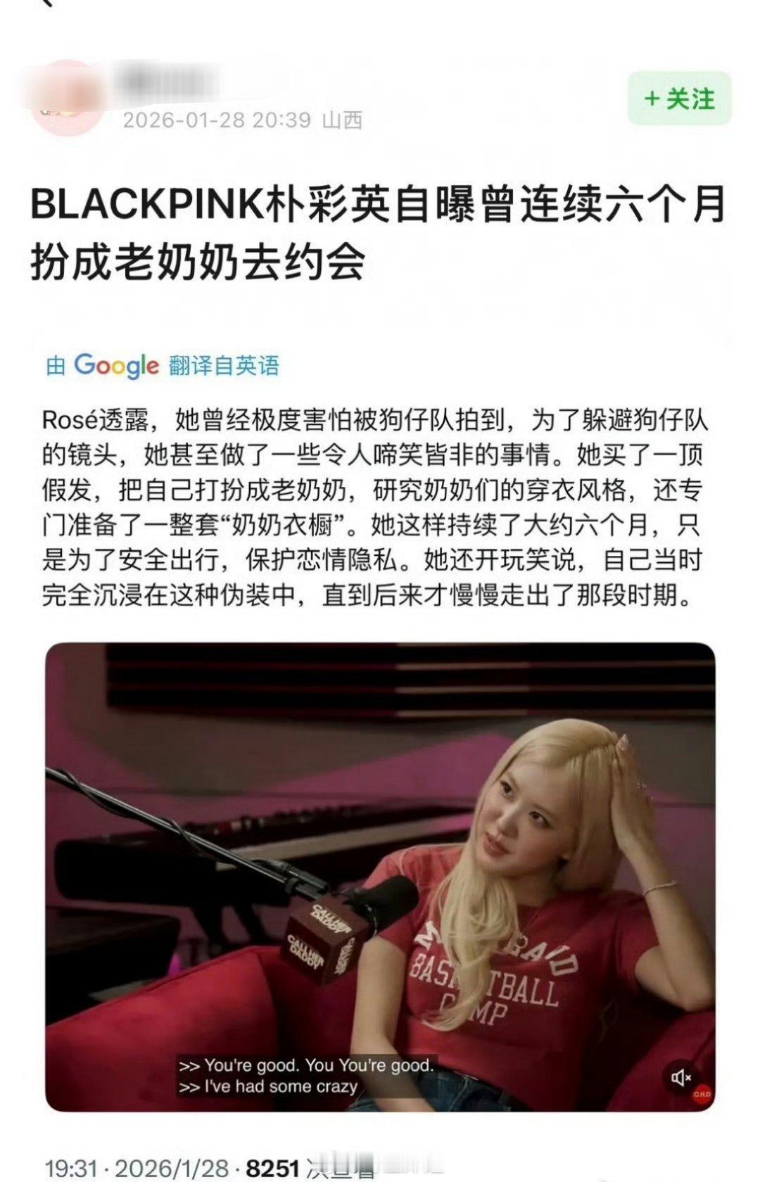 朴彩英自己爆料说自己为了去见爱人,直接连续六个月扮成老奶奶去约会,之所以不公开恋情,是为了保护自己爱的人,也是很惊人啊