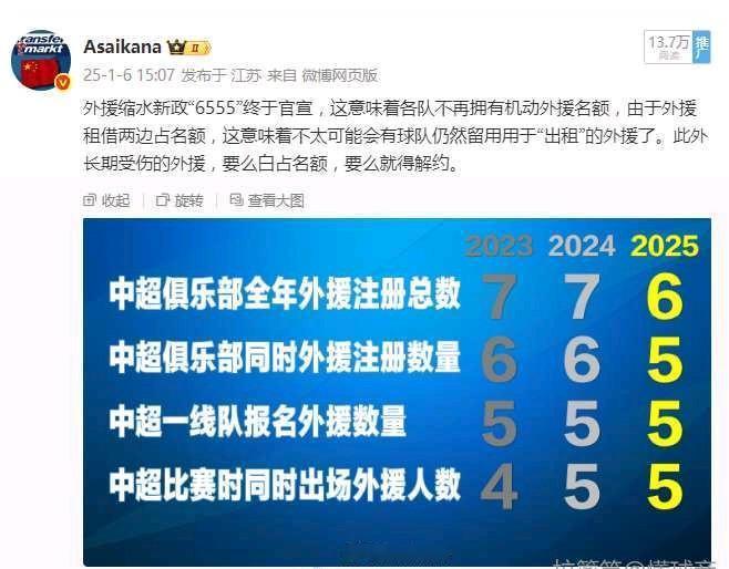 中超外援政策要调整了? 1月28日,西乙莱加内斯官方宣布,上海申花外援阿苏埃租借加盟俱乐部,含买断选项。 那么问题来了,阿苏埃租借西乙,占不占申花的外援注册名额,有的人说租借到国外联赛不占用名额,有的说占用。 按照德转朱艺之前的解释,加上2025年中超“6555”的外援政策,应该是占申花外援注册名额,除非接下来外援政策有调整! 下图一,朱艺解释外援租借占用出租方外援名额,下图二是2025年外援政策解释!上海申花
