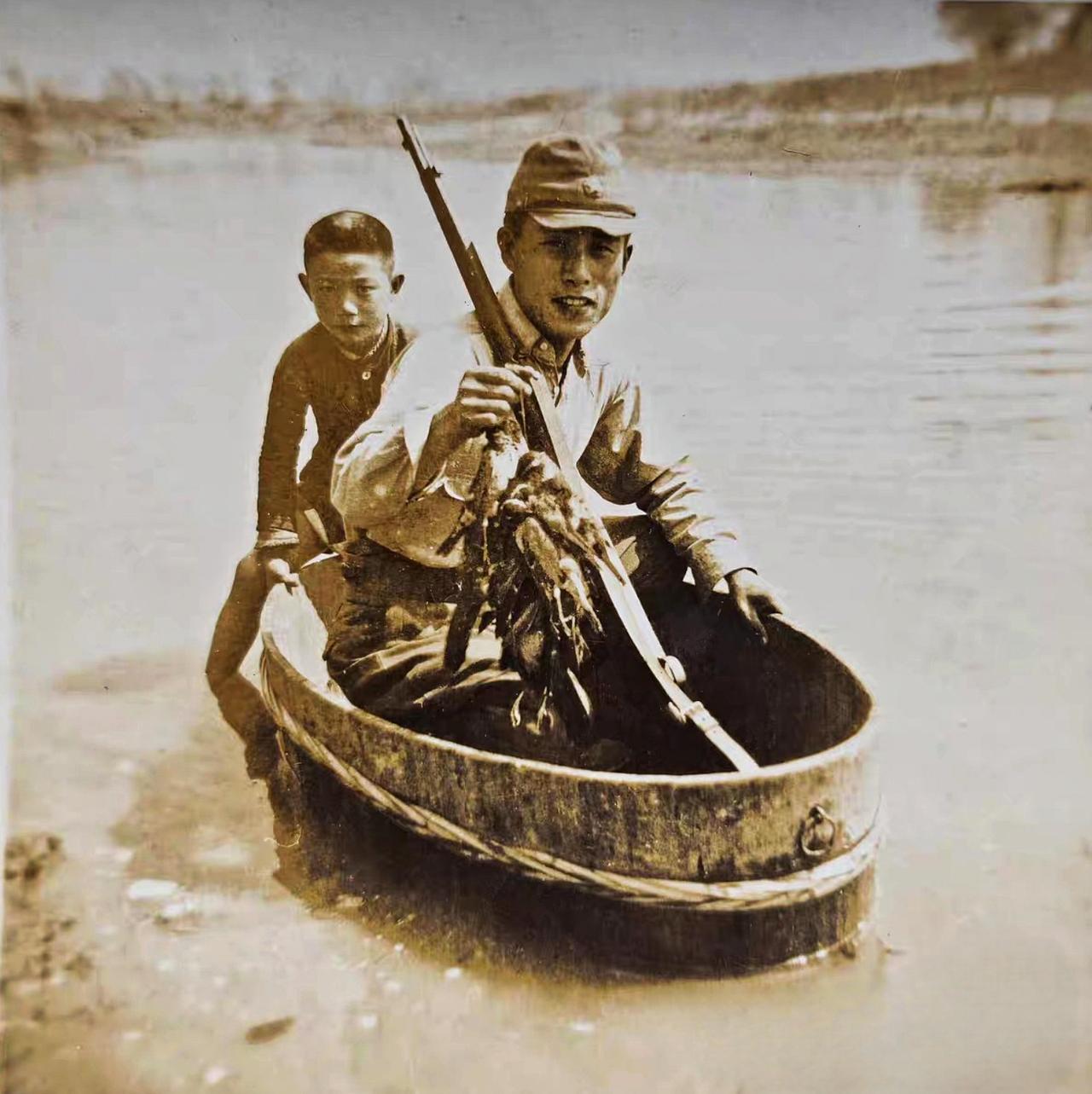 这是一张很神奇的照片。一个日军士兵扛着步枪乘坐在一个木盆子上,后面还有一个中国小男孩推着。为什么神奇?你看日军士兵提着一串麻雀,原来是日军打麻雀改善军队伙食。但是为什么要坐在木盆上打麻雀呢?木盆在水面上很摇晃,一定都不稳定,但是日军打得这么多麻雀,说明他们单兵的枪法很准。