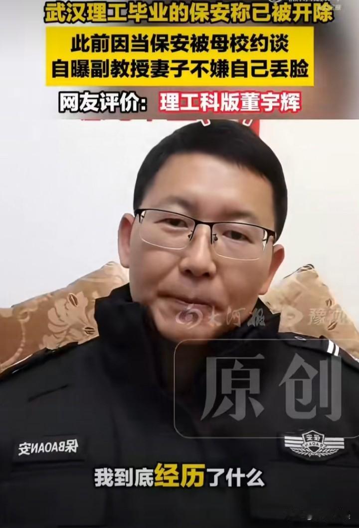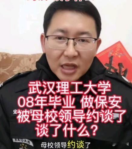 刚刚看到被武汉理工大学约谈的毕业生,被保安开除了。 这哥们是武汉理工大学的高材生,但是毕业之后做了保安。曾把自己当保安的视频发布到网上,正巧被母校看到了,之后就他就被母校约谈了。 现在他发视频说保安也不好干被开除了,真的是让人感到唏嘘。 有人觉得一个高校毕业的高材生,去当保安是不是太屈才了,毕竟像他这样的,去当保安躺平实在是无法理解。 也有人认为现在的大学生就业本来就很困难,保安也算是一份职业,也能让自己有一份收入,不丢人。 大家觉得高校毕业的高材生去当保安是否是屈才了。