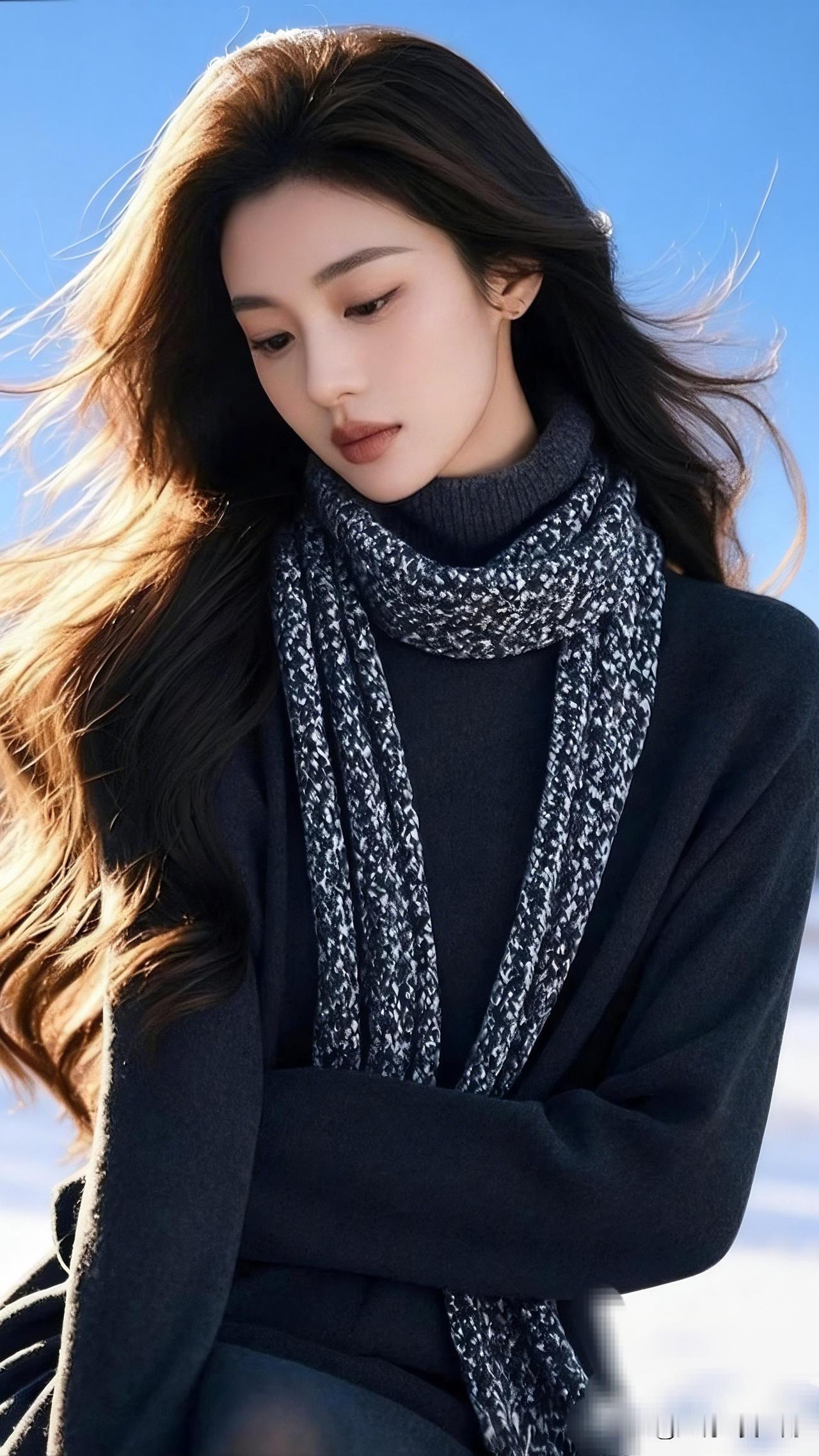 冬日暖阳下,温柔长发飘逸,黑白围巾点缀,尽显优雅气质。看看气质女神的穿着搭配吧