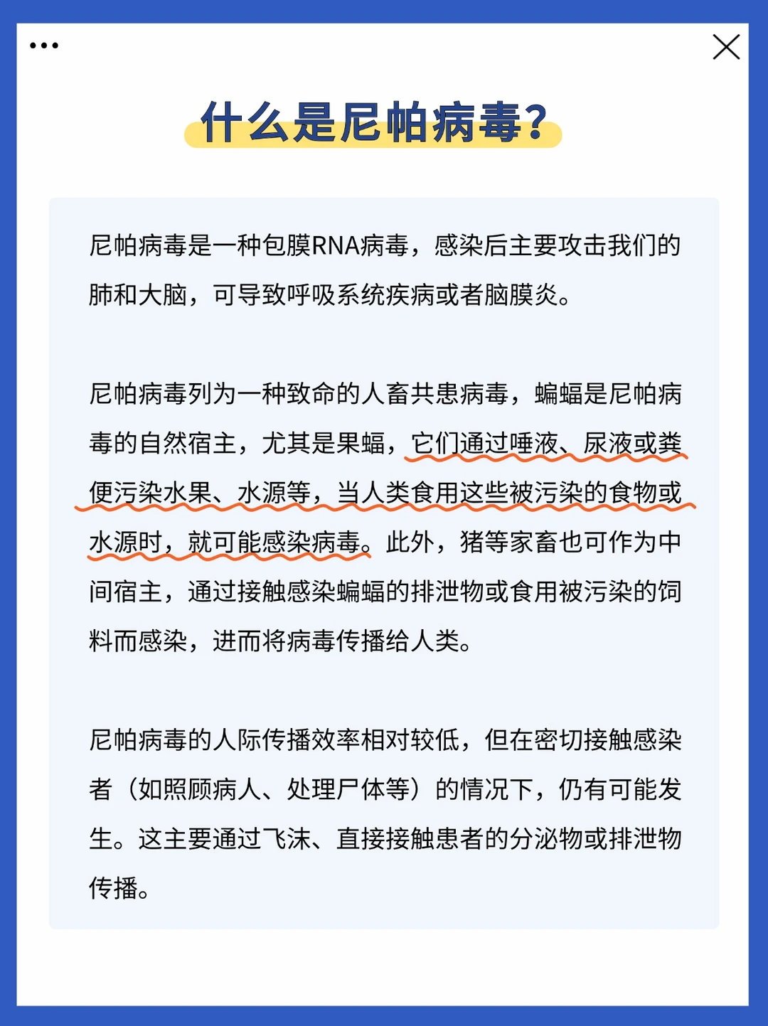 尼帕病毒是人都怕,死亡率40%—75%。可通过飞沫和唾液在人与人之间传播,且致死