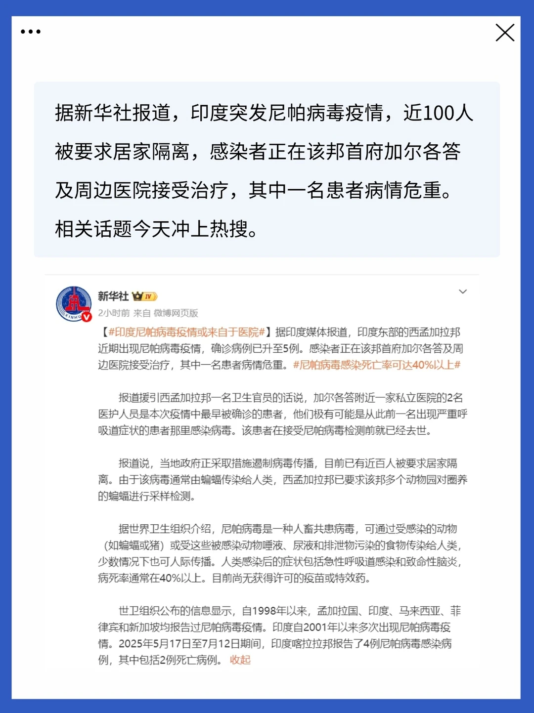 尼帕病毒!!熟悉的时间,熟悉的方法,是不是一切按照2020年再复制一次,上一次