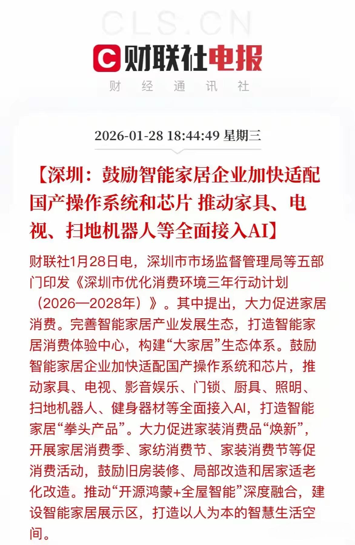 加速国产化替代,深圳:鼓励智能家居企业加快适配国产操作系统和芯片! 那智能家居企业方面又要迎来新的发展方向,那很多都将是智能化,那国产操作系统和芯片都是国产天代化,会推动整个中国智能化装备产业链的升级与发展,尤其是在操作系统与芯片行业的发展,企业将迎来更多的发展与利润增长!尤其是AI加行动,大力支持AI应用场景,进入各个行业发展以及适配!要全面带动国产芯片半导体发展,真正落实到国产替代化!