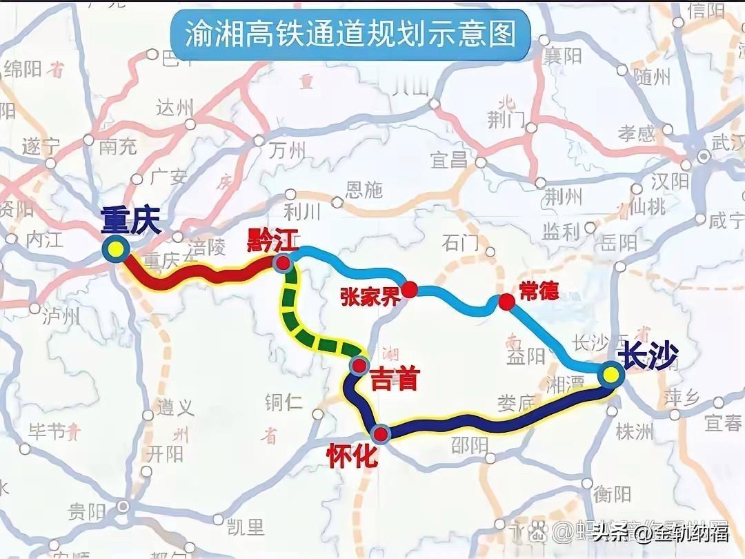 454.27亿落地黔吉高铁! 黔吉高铁这事儿有大进展啦!就是重庆黔江到湖南吉首的那条高铁。 2026年1月初已经过了项目评估和行业评审,正式进入立项审批阶段。 就等国家发改委批可行性研究报告了,估计今年内就能开工。 这条高铁可不是小工程,是渝湘高铁的核心段,还是国家“八纵八横”高铁网里厦渝通道的重要部分。 以后从成渝地区去粤港澳大湾区也能走这儿。线路从在建的重庆黔江站出发,往南经过重庆的黔江区、酉阳县、秀山县。 再进湖南湘西州的花垣县、保靖县、吉首市,最后连到已经有的张吉怀高铁吉首东站。整个线路全长约224公里,重庆段占了152.6公里,湖南段71.6公里。 设计时速350公里,跑起来那叫一个快。 全线要设5个车站,其中酉阳西站、秀山北站、花垣站是新修的,黔江站和吉首东站是用现有的车站改造接入。 项目总投资得454.27亿元,光重庆段就差不多300亿元,计划建5年左右,2030年前有望通车。 现在项目推进挺顺利,可行性研究报告2025年4月就上报了,国铁集团已经审查通过。就等国家发改委正式批复,黔江区交通局说今年二季度前大概率能批下来。 而且重庆段的建设用地预审也拿到了自然资源部的批复,初步设计预审会也开了。 环评报告也在加紧做,都在为开工做准备。 等这条高铁建好,重庆到长沙就能全程350 公里时速直达。