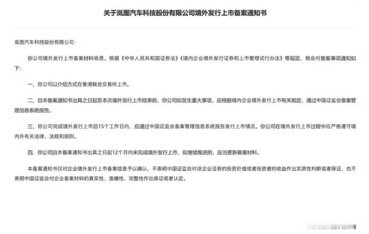 【岚图汽车以介绍方式在香港联合交易所上市获中国证监会备案】1月28日,中国证监会国际合作司发布关于岚图汽车科技股份有限公司境外发行上市备案通知书,公司以介绍方式在香港联合交易所上市。
