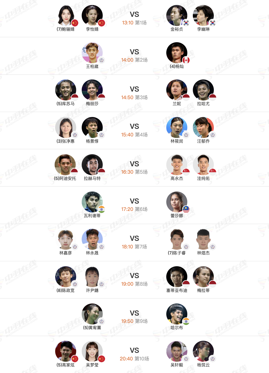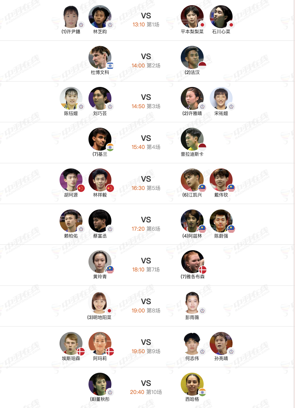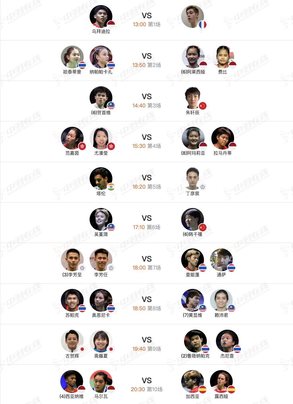 2026年泰国羽毛球大师赛 1月29日各单项16进8赛程,下午13点开赛:【1号场地】10、程星/张驰🇨🇳 vs 🇹🇭普瓦纳特/本雅帕【2号场地】3、朱轩辰🇨🇳 vs 🇲🇾贺首维6、韩千禧🇨🇳 vs 🇲🇾吴堇溦【3号场地】5、胡珂源/林祥毅🇨🇳 vs 🇲🇾江凯兴/戴伟钦(1-4)【4号场地】1、鲍骊婧/李怡婧🇨🇳vs 🇰🇷金裕贞/李幽琳10、高家炫/吴梦莹🇨🇳 vs 吴轩毅/杨筑云