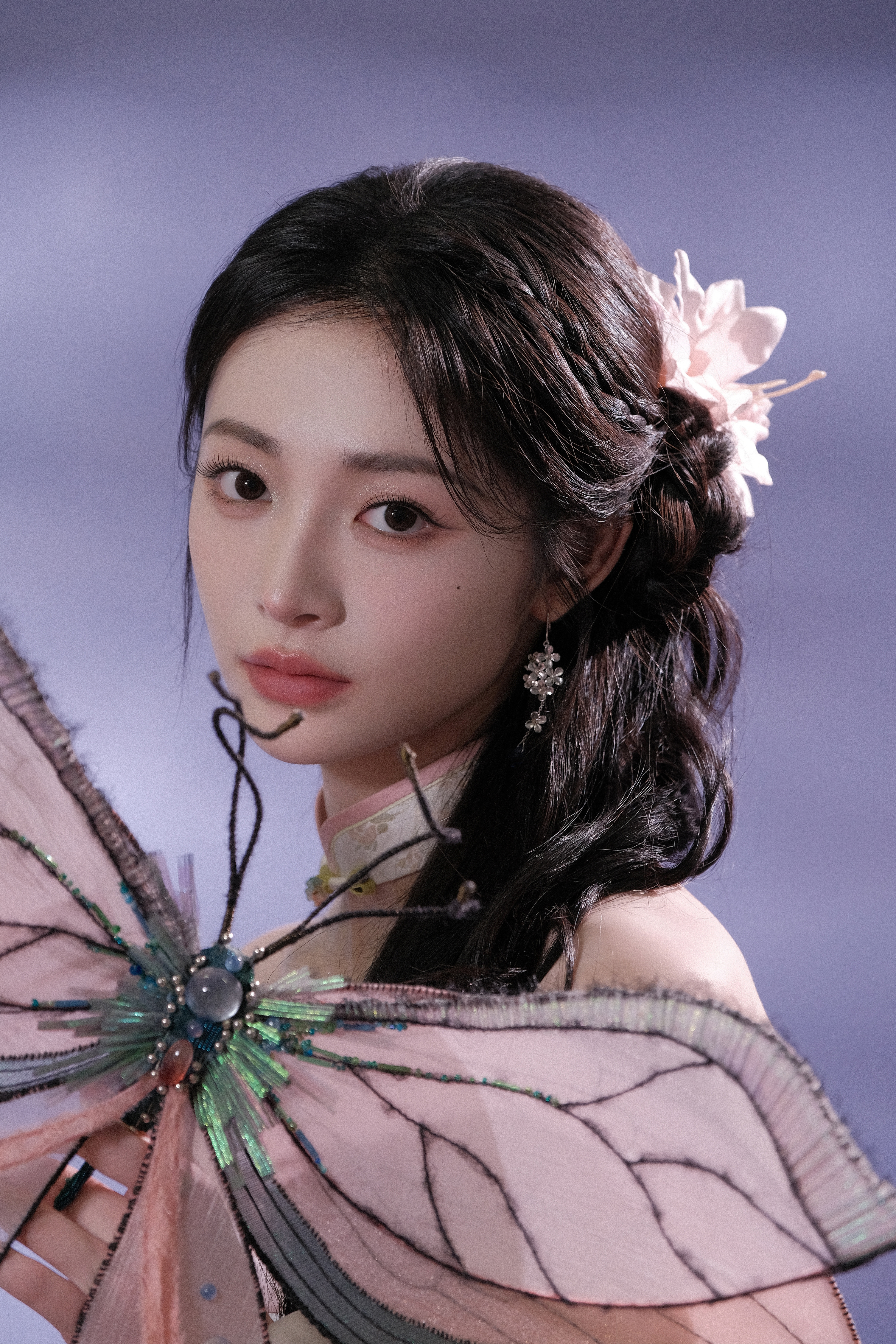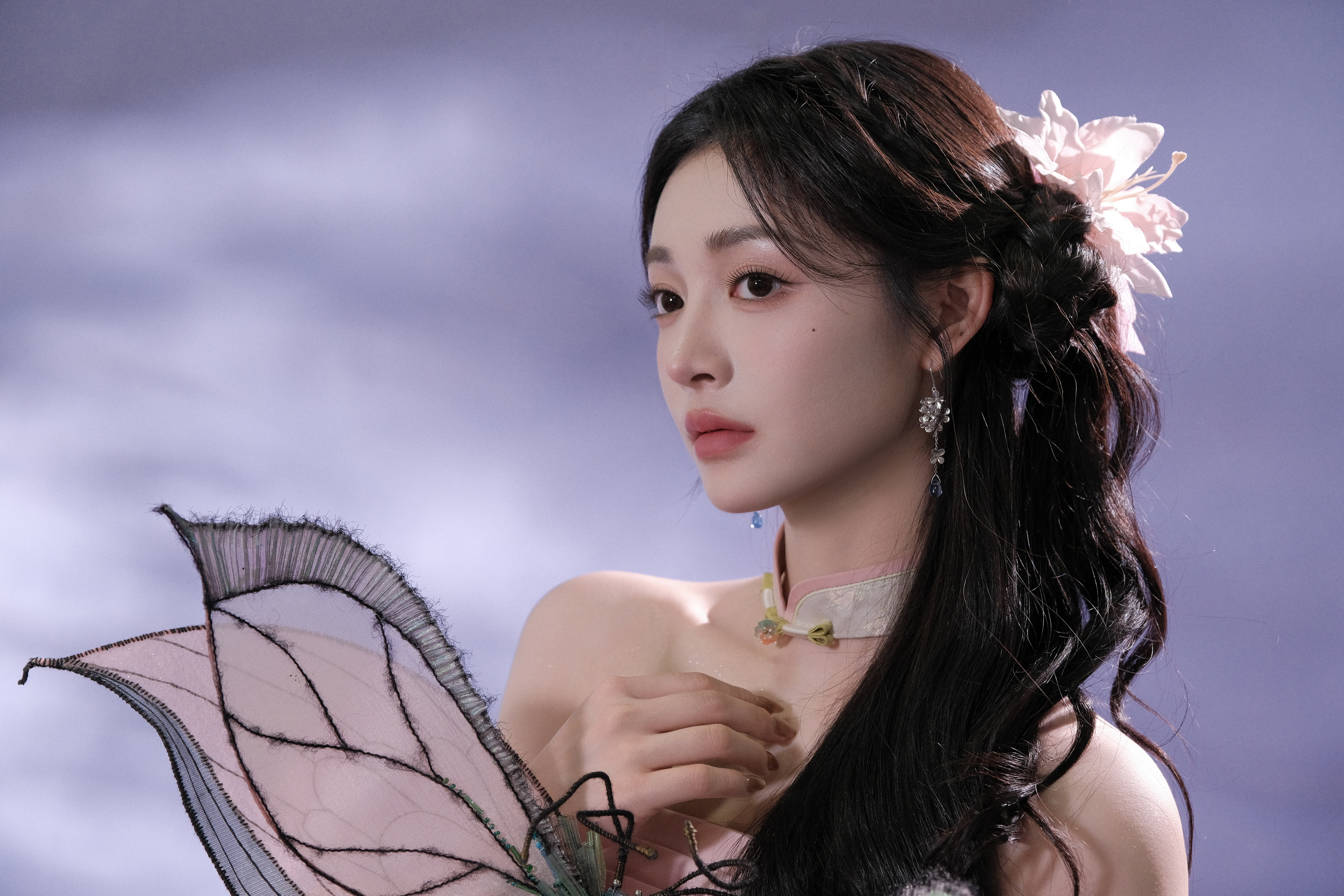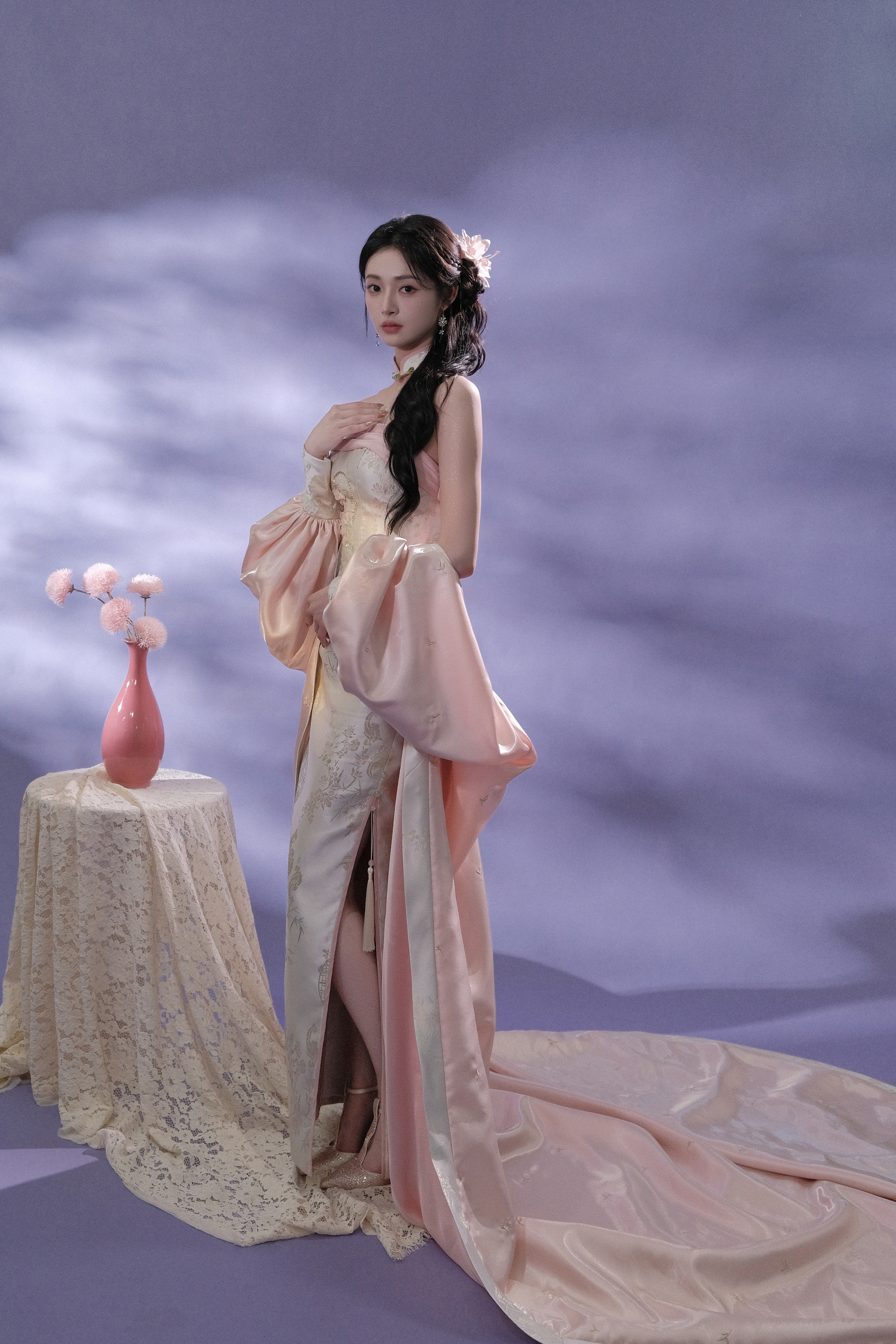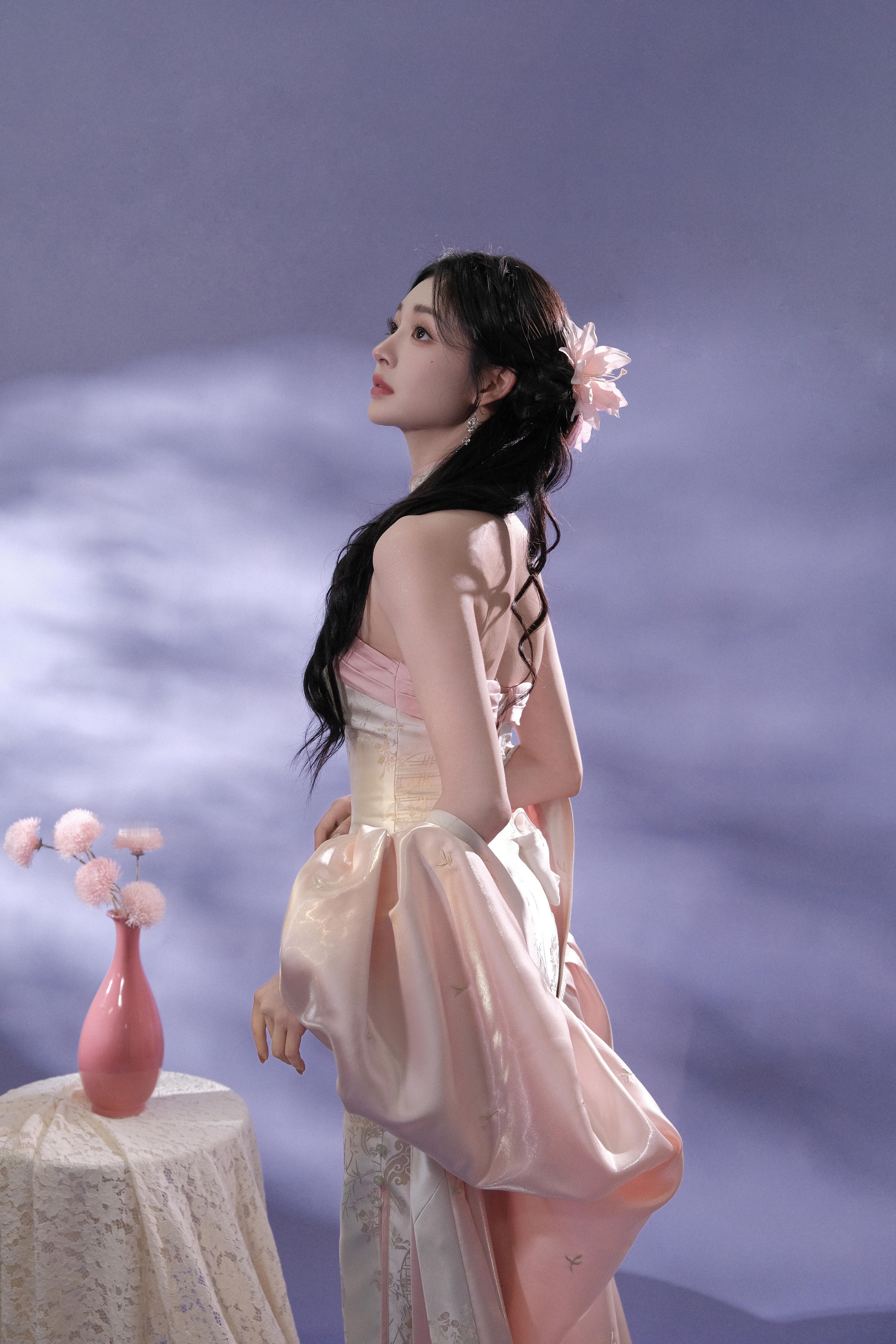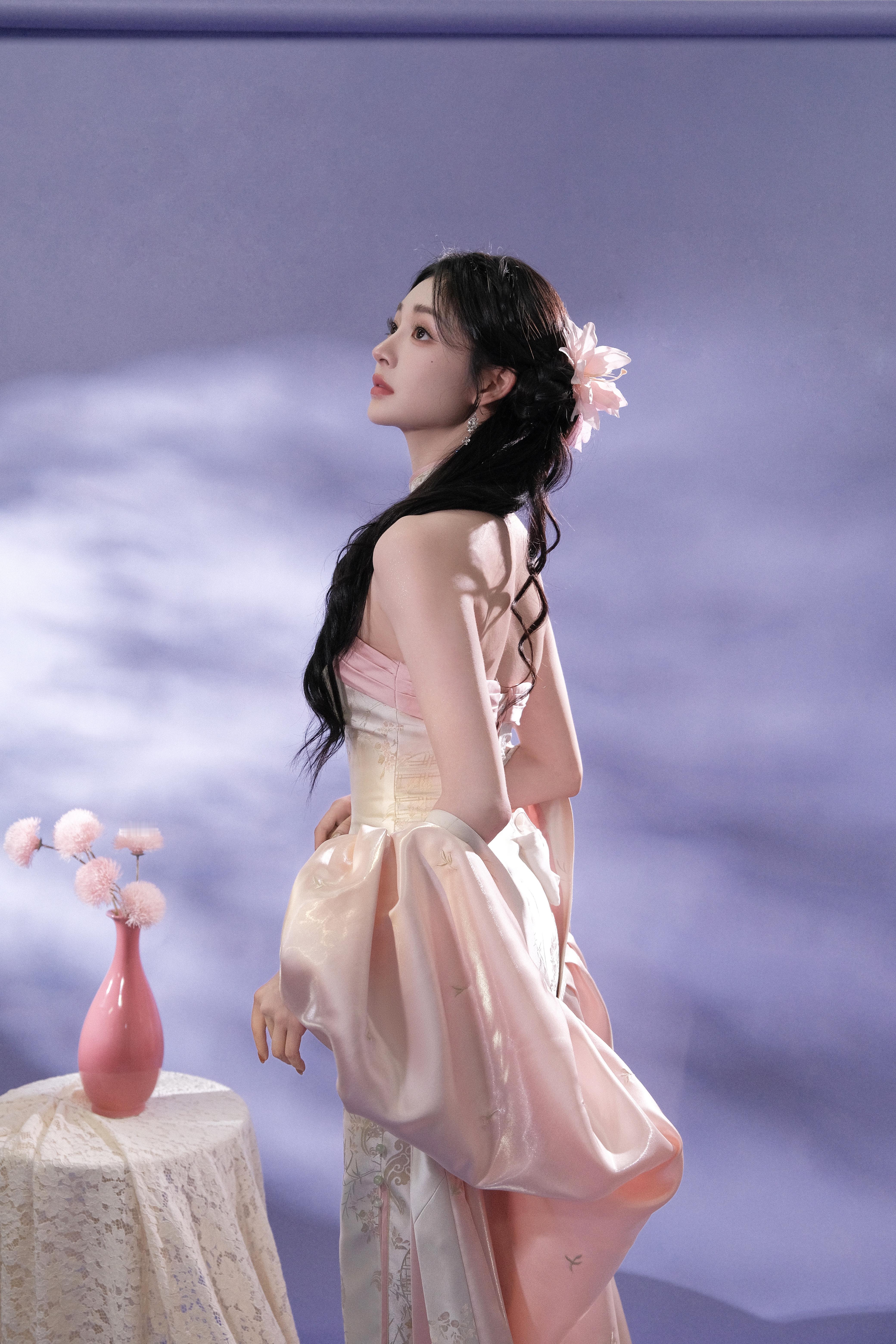 周洁琼 一袭粉裙,勾勒柔美曲线,发间花饰点缀,在淡紫氤氲中,如古典画中走出的佳人,尽展温婉雅致。