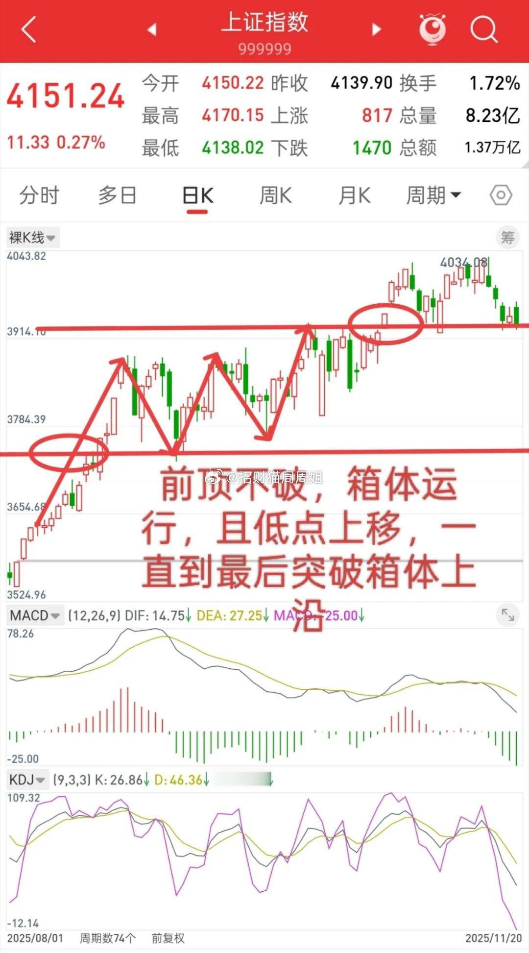 截止到今天为止,大盘依然在4080-4190这个箱体运行,后市行情操作策略:越接近前高4190附近,风险大于机会,因为要谨防双顶。同时,越靠近4100附近,机会越大于风险。这个箱体早晚会走出来,如往上突破4190,后面回踩不破,那就上一个台阶。如跌破4080,后面反弹不过去,那就下一个台阶。