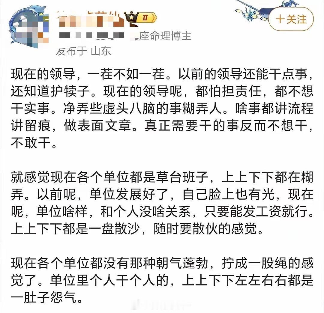 确实如此,都务虚!看了网友吐槽自己单位的领导,居然有惊人的相似。因为确实现在的领导不敢护犊子、不敢担责任,也不会会自己手下的兄弟考虑一些福利。不管做什么事,都讲究流程,简单的事复杂化、复杂的事情抽象化。