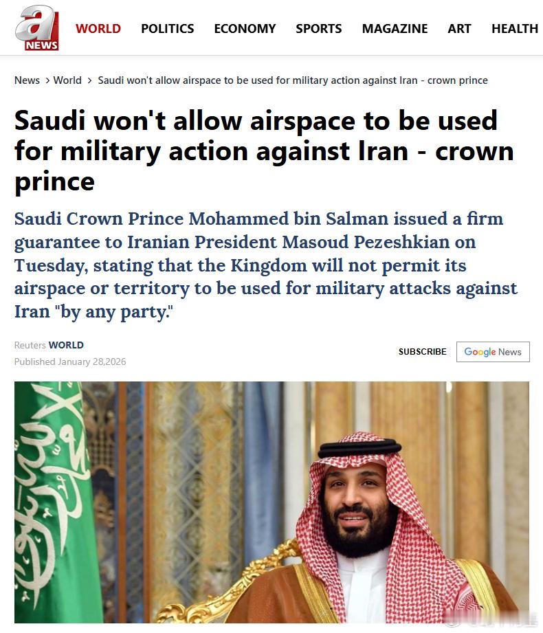 据沙特通讯社(SPA)报道,沙特王储表示,沙特阿拉伯不会允许其领空或领土被用于对伊朗的任何军事行动。来源:anews伊朗宣布暂时关闭领空伊以冲突最新进展汇总美国派出重兵合围伊朗