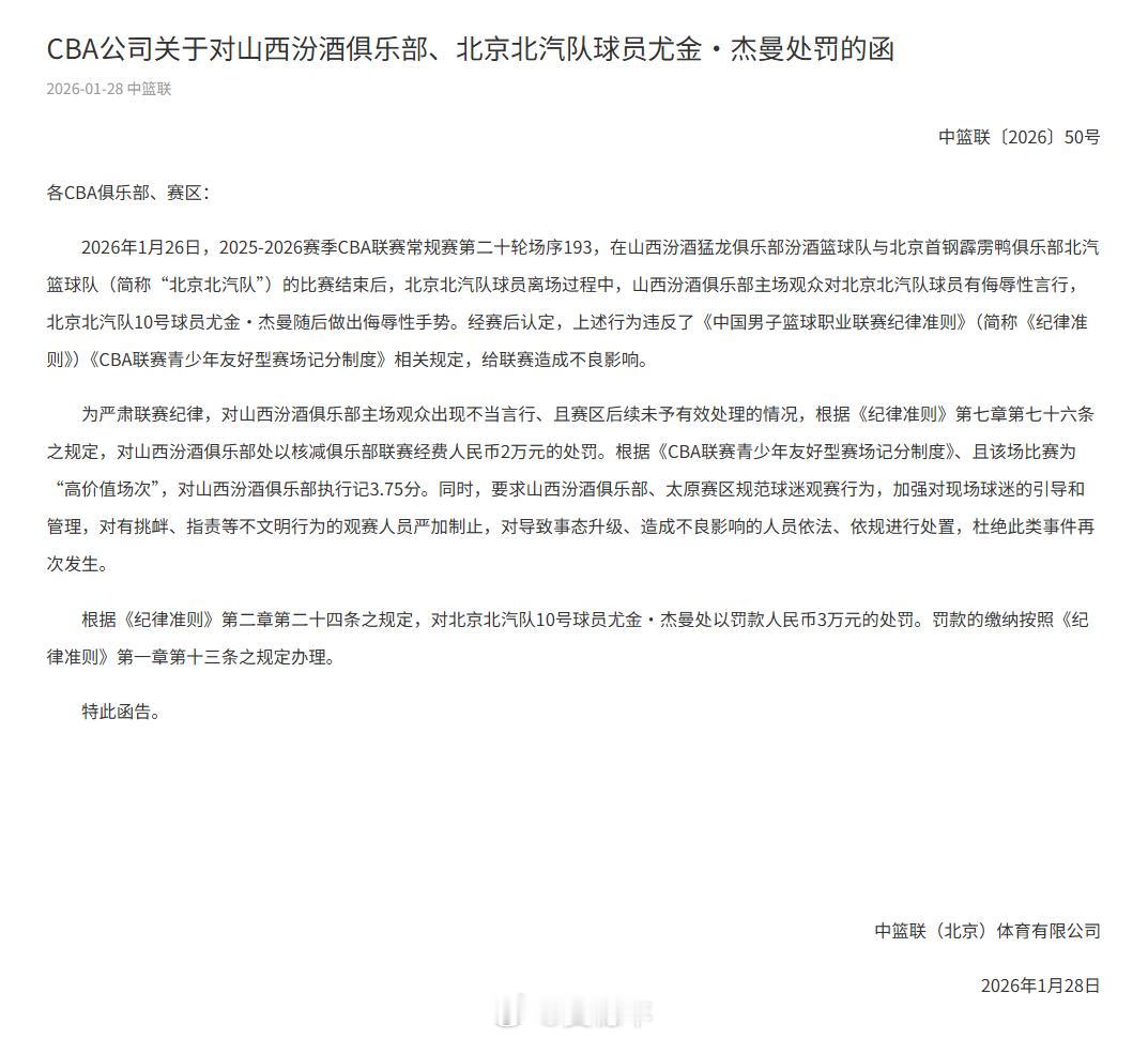 CBA公司发布公告,山西男篮主场观众对北京男篮球员有侮辱性言行,且山西赛区后续未予有效处理,山西男篮被核减俱乐部联赛经费人民币2万元,执行记3.75分;北京男篮外援杰曼做出侮辱性手势,被罚款人民币3万元。CBA官方公布对山西北京的罚单山西球迷向北京球员吐口水