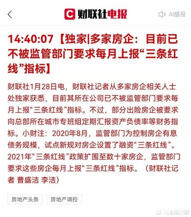 大新闻:房地产三条红线,取消了!1月28日今天下午,财联社记者从多家房企相关人士处独家获悉,目前其所在公司已不被监管部门要求每月上报“三条红线”指标。不过,部分出险房企被要求向总部所在城市专班组定期汇报资产负债率等财务指标。2020年8月,监管部门为落实房住不炒,试点对房企设置了融资“三条红线”。2021年“三条红线”政策扩围至数十家房企,监管部门要求这些房企每月上报“三条红线”指标。然后就是大家看到的,诸多房企倒下,房价大跌,通缩开始,消费降级。不过最近两个月开始,一线和二线城市楼市成交量年底翘尾严重,比如上海、深圳、杭州、苏州等均是在没有新政加持的基础上实现的自我反弹,北京则是在平安夜政策的刺激下,也实现了翘尾。最近上海很多中介都在反应,年底了,挂牌量下降很快,买房的客户没有合适房子可选,买不到房,房东信心有些回升。那么这就注定年后的小阳春应该会很火热。如果年后两会全国层面能有进一步的政策加持,那么止跌回稳还是很有希望的。我最近接触的几个中介兄弟都在说,上海目前房价跌幅收窄了,房东不愿意再大幅降价割肉了,房东和买家都在等政策,都在观望,看看有没有新政策出来。现在其实就是到了一个最关键的博弈节点,房东胜,房价就涨了,买家胜,房价就继续跌。核心就一个,年后的政策必须跟上。所以,三条红线现在也松了,房住不炒也不提了。是不是高层认为,房价已经调整到位了。亲儿子,该抱一抱了!