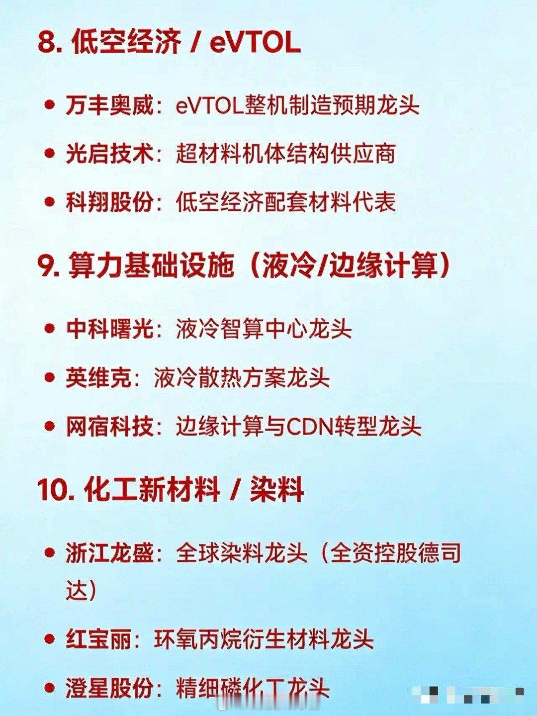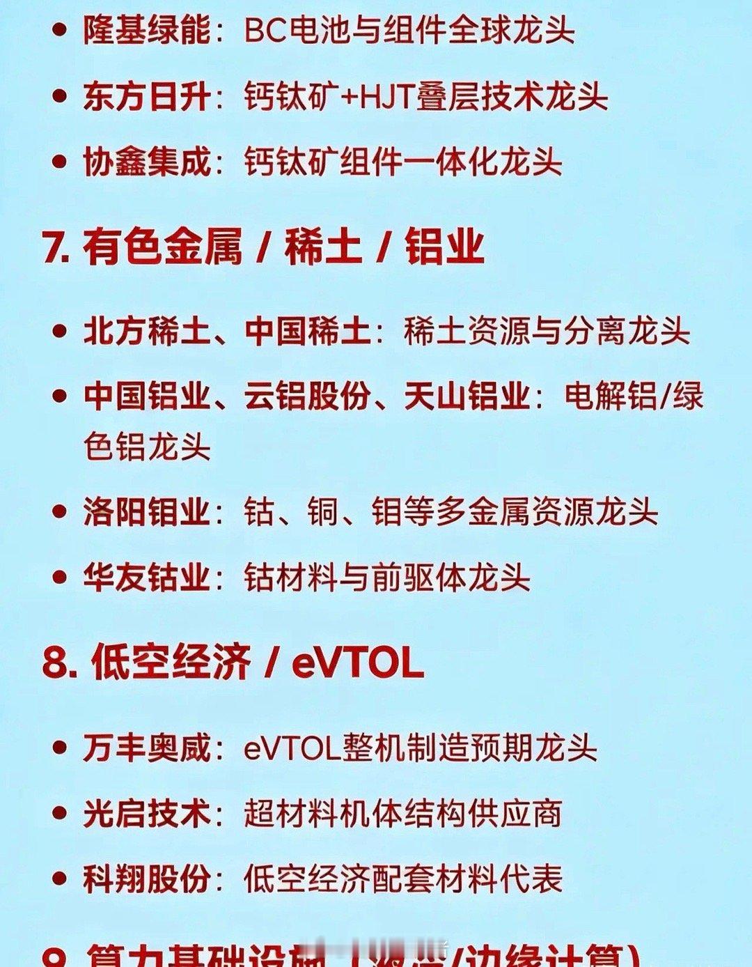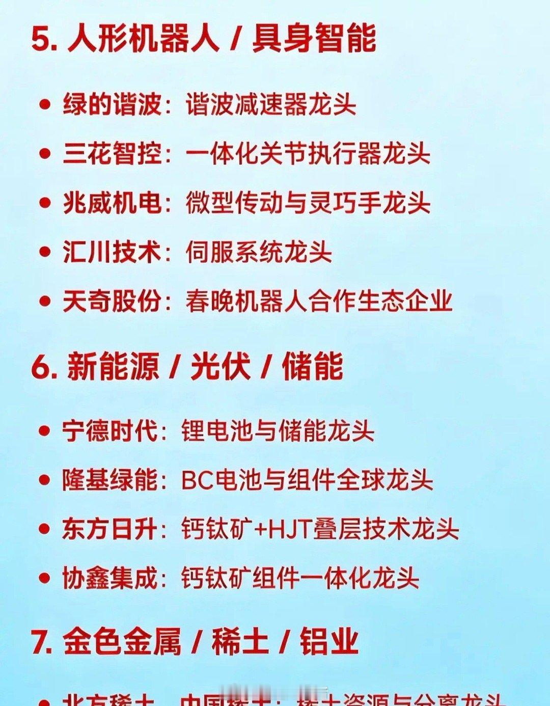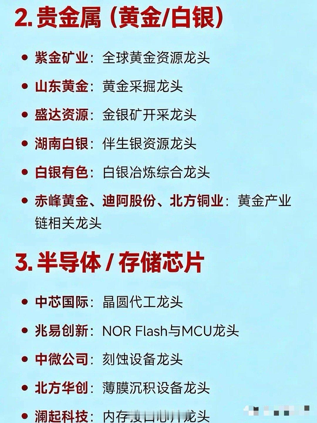 2026年1月28日十大热点概念核心企业• 商业航天/卫星互联网:中国卫通是国内唯一专注卫星通信运营的企业,为卫星互联网运营龙头。中国卫星是航天科技集团五院旗下唯一卫星总装上市平台,乃卫星研制整机龙头。航天电子是卫星电子系统配套领军者,星间激光通信技术领先。巨力索具是火箭结构件领域龙头企业。超捷股份专注于火箭箭体制造,为该领域龙头。中超控股则是航天连接器方面的龙头企业。• 贵金属(黄金/白银):紫金矿业是全球前三的综合性跨国矿业巨头,为全球黄金资源龙头。山东黄金矿产金产量多年位居国内首位,是黄金采掘龙头。盛达资源专注白银业务,是金银矿开采龙头。湖南白银是国内白银冶炼标杆,为伴生银资源龙头。白银有色是白银冶炼综合龙头企业。赤峰黄金、北方铜业等是黄金产业链相关龙头企业。• 半导体/存储芯片:中芯国际是国内晶圆代工龙头企业。兆威创新是NOR Flash与MCU领域龙头。中微公司的刻蚀设备技术先进,为刻蚀设备龙头。北方华创平台化布局,是薄膜沉积设备龙头。澜起科技在内存接口芯片领域占据领先地位。佰维存储是嵌入式存储模组龙头企业。国科微、中微半导是主控/电源管理芯片涨价代表企业。• AI应用/智能体/大模型:岩山科技是AI智能体+脑机接口平台龙头企业。工业富联是AI服务器及算力代工领域的龙头。中际旭创是全球光模块龙头,为光模块/CPO龙头企业。光正眼科、蜂助手等是AI应用落地的代表企业。• 人形机器人/具身智能:绿的谐波在谐波减速器领域技术领先,为该领域龙头。三花智控是一体化关节执行器龙头。兆威机电专注微型传动与灵巧手,是该领域龙头企业。汇川技术是伺服系统龙头。天奇股份是春晚机器人合作生态企业,在相关领域有独特优势。• 新能源/光伏/储能:宁德时代是全球锂电池与储能领域的龙头企业。隆基绿能是BC电池与组件的全球龙头。东方日升在钙钛矿+HJT叠层技术方面领先,为该技术领域龙头。协鑫集成是钙钛矿组件一体化龙头企业。• 有色金属/稀土/铝业:北方稀土和中国稀土是稀土资源与分离领域的龙头企业。中国铝业、云铝股份等是电解铝及绿色铝龙头。洛阳钼业拥有丰富的钴、铜、钼等资源,是多金属资源龙头。华友钴业是钴材料与前驱体领域的龙头企业。• 低空经济/eVTOL:万丰奥威有望成为eVTOL整机制造龙头企业。光启技术是超材料机体结构供应商,在该领域具有独特优势。科翔股份是低空经济配套材料代表企业。• 算力基础设施(液冷/边缘计算):中科曙光是液冷智算中心龙头企业。英维克提供液冷散热方案,是该领域龙头。网宿科技在边缘计算与CDN转型方面表现突出,为相关龙头企业。• 化工新材料/染料:浙江龙盛是全球染料龙头企业,全资控股德司达。红宝丽是环氧丙烷衍生材料龙头。澄星股份是精细磷化工领域的龙头企业。