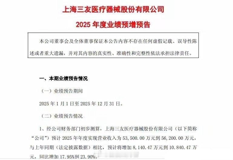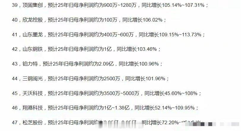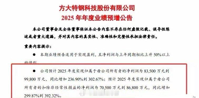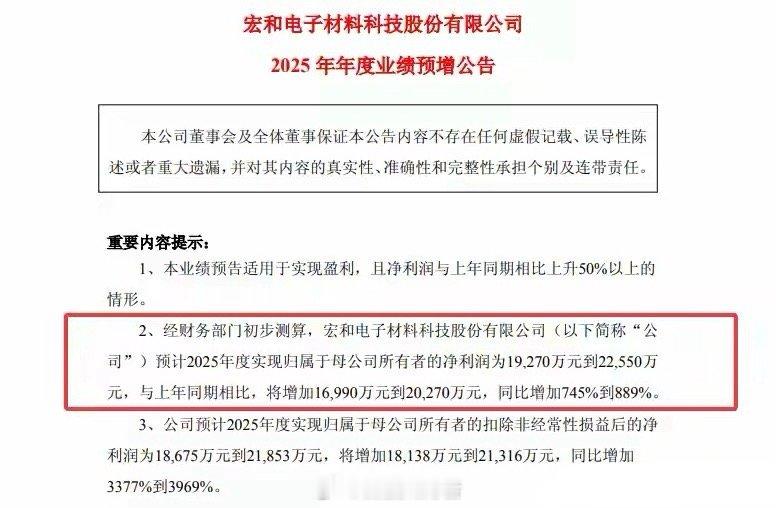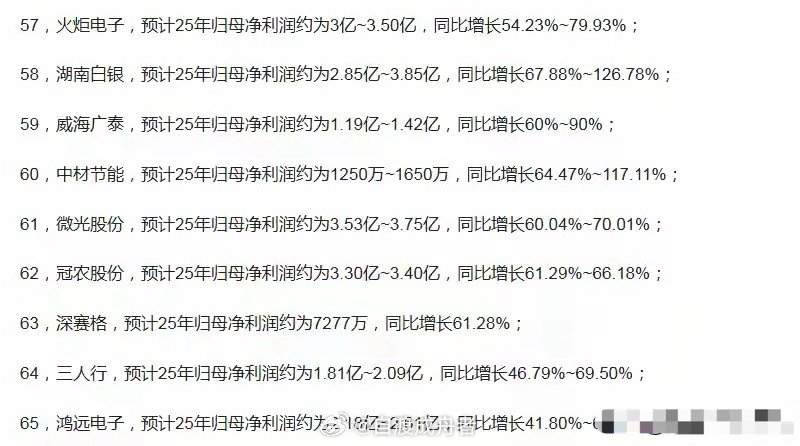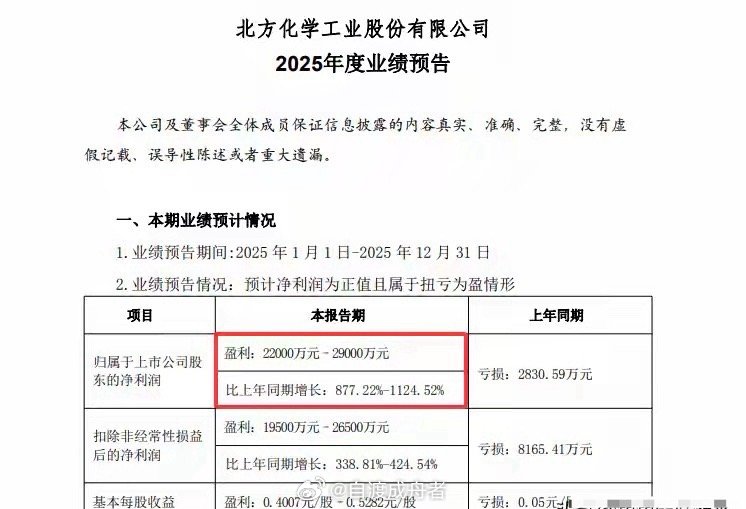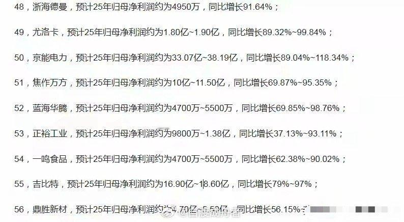 突发!盘后88家公司年报预增,5家增幅超3倍,最高预增近1125%随着年报行情持续推进,上市公司业绩预告密集发布。业绩预增、尤其是超预期高增的标的,往往是后续市场的重点关注方向,即便短期暂无合适入场时机,提前梳理复盘,也能把握后续布局机会。经统计,本次盘后共有88家公司披露年报预增公告,其中5家企业归母净利润同比增幅突破3倍,最高预增幅度接近1125%,具体公司及业绩亮点梳理如下。一、5家高增龙头企业详情北化股份作为全球硝化棉龙头,同时也是国内唯一具备核化生三防器材科研生产资质的企业,公司核心产品涵盖硝化棉、三防装备、特种工业泵,客户覆盖国内各大军工集团以及阿克苏·诺贝尔等世界500强企业,产品远销全球50余个国家和地区。公司预计2025年归母净利润为2.20亿-2.90亿元,同比增长877.22%-1124.52%。业绩大幅预增,主要得益于报告期内纤维素及其衍生物产业、防化及环保产业营收同比提升,同时产品毛利率有所上涨。宏和科技公司是全球极薄电子布细分领域龙头,主营中高端电子级玻璃纤维布,包含AI服务器专用低介电布等高端产品,核心客户包括苹果、华为、沪电股份等知名企业。预计2025年实现归母净利润1.93亿-2.26亿元,同比增长745%-889%。业绩高增核心驱动力为AI产业快速发展,带动终端市场需求上涨,电子级玻璃纤维布供需偏紧,产品售价提升,直接推动净利润快速增长。三友医疗国内脊柱植入物细分领域龙头,也是行业内少数拥有原始创新能力的企业,核心产品包括脊柱/创伤植入物、超声动力设备、椎体成形耗材等。业务覆盖国内超2000家医院,海外产品通过CE认证,销往欧美澳等20多个国家和地区。公司预计2025年归母净利润5600万-7280万元,同比增长388.29%-534.78%。业绩增长主要有三大原因:一是创新疗法与新产品放量,带动主营业务稳步增长;二是超声骨刀业务营收与利润快速攀升;三是国际化布局持续扩张,控股公司营收同比增长32.62%,有效增厚整体业绩。合力科技位列中国农药出口20强、销售50强,主营除草剂、杀虫剂等四大系列农药原药及制剂,具备年产1.4万吨原药、3万吨制剂的产能,拥有370个全球产品登记资质,业务遍及全球五大洲70多个国家和地区。预计2025年归母净利润2600万-3600万元,同比增长331.33%-420.30%。业绩增长主要源于报告期内公司大力拓展模具业务,出口模具产销量同比大幅提升,成为业绩新的增长点。方大特钢国内重要的弹簧扁钢精品生产基地,同时是江西地区核心钢筋供应企业,主打弹簧扁钢、建筑钢材等产品,在汽车用钢细分市场占有率位居前列。公司预计2025年归母净利润8.35亿-9.98亿元,同比增长236.90%-302.67%。业绩预增主要有四点因素:上游原燃料价格回落,钢材产品盈利空间修复;生产端推行精细化管理,降本增效成效显著;优化产品结构,提升高毛利产品产销比例;所持信托产品增值约1.3亿元,投资收益同比大幅增加。二、其余83家预增公司按增幅分类汇总预增2倍-3倍区间1. 真爱美家:2025年预计归母净利润2.02亿-2.96亿元,同比增长166.96%-290.67%2. 华丰科技:2025年预计归母净利润3.38亿-3.88亿元,同比增长204.17%-285.85%3. 佳都科技:2025年预计归母净利润1.60亿-2亿元,同比增长239.28%-274.10%4. *ST华峰:2025年预计归母净利润650万-800万元,同比增长238.78%-270.80%5. 丰山集团:2025年预计归母净利润3260万-4860万元,同比增长184.40%-225.82%6. 苏常柴A:2025年预计归母净利润4500万-6000万元,同比增长143.38%-224.50%预增1.5倍-2倍区间1. 中复神鹰:2025年预计归母净利润8000万-1.20亿元,同比增长164.32%-196.48%2. 博云新材:2025年预计归母净利润4900万-6200万元,同比增长172.88%-192.22%3. 明阳智能:2025年预计归母净利润8亿-10亿元,同比增长131.14%-189.92%4. 超讯通信:2025年预计归母净利润3600万-5400万元,同比增长158.29%-187.43%5. *ST宝实:2025年预计归母净利润6900万-9000万元,同比增长164.61%-184.27%6. 长川科技:2025年预计归母净利润12.50亿-14亿元,同比增长172.67%-205.39%7. 奥精医疗:2025年预计归母净利润1353.17万元,同比增长206.87%8. 歌力思:2025年预计归母净利润1.60亿-2.10亿元,同比增长151.69%-167.84%9. 深深房A:2025年预计归母净利润8080万-1.21亿元,同比增长145.72%-168.59%10. 江山股份:2025年预计归母净利润4.80亿-5.80亿元,同比增长113.90%-158.47%11. 中牧股份:2025年预计归母净利润1.49亿-1.92亿元,同比增长109.62%-171.27%预增1倍-1.5倍区间1. 嘉元科技:2025年预计归母净利润5000万-6500万元,同比增长120.94%-127.22%2. 德新科技:2025年预计归母净利润3800万-4900万元,同比增长125.15%-132.44%3. 翰宇药业:2025年预计归母净利润4000万-5000万元,同比增长123.03%-128.79%4. 上海家化:2025年预计归母净利润2.40亿-2.90亿元,同比增长128.81%-134.81%5. 奥飞娱乐:2025年预计归母净利润6000万-8000万元,同比增长121.03%-128.04%6. 西藏珠峰:2025年预计归母净利润4.42亿-5.40亿元,同比增长92.28%-135.01%7. 矩华股份:2025年预计归母净利润5800万-8000万元,同比增长72.12%-137.40%8. 润贝航科:2025年预计归母净利润1.65亿-2.10亿元,同比增长86.39%-137.22%9. 蠡湖股份:2025年预计归母净利润1.10亿-1.30亿元,同比增长98.12%-134.14%10. 长光华芯:2025年预计归母净利润1877.51万元,同比增长118.82%11. 天创时尚:2025年预计归母净利润1200万-1600万元,同比增长113.21%-117.62%12. 天奇股份:2025年预计归母净利润4500万-6500万元,同比增长117.64%-125.48%13. 粤海饲料:2025年预计归母净利润1500万-2000万元,同比增长117.5