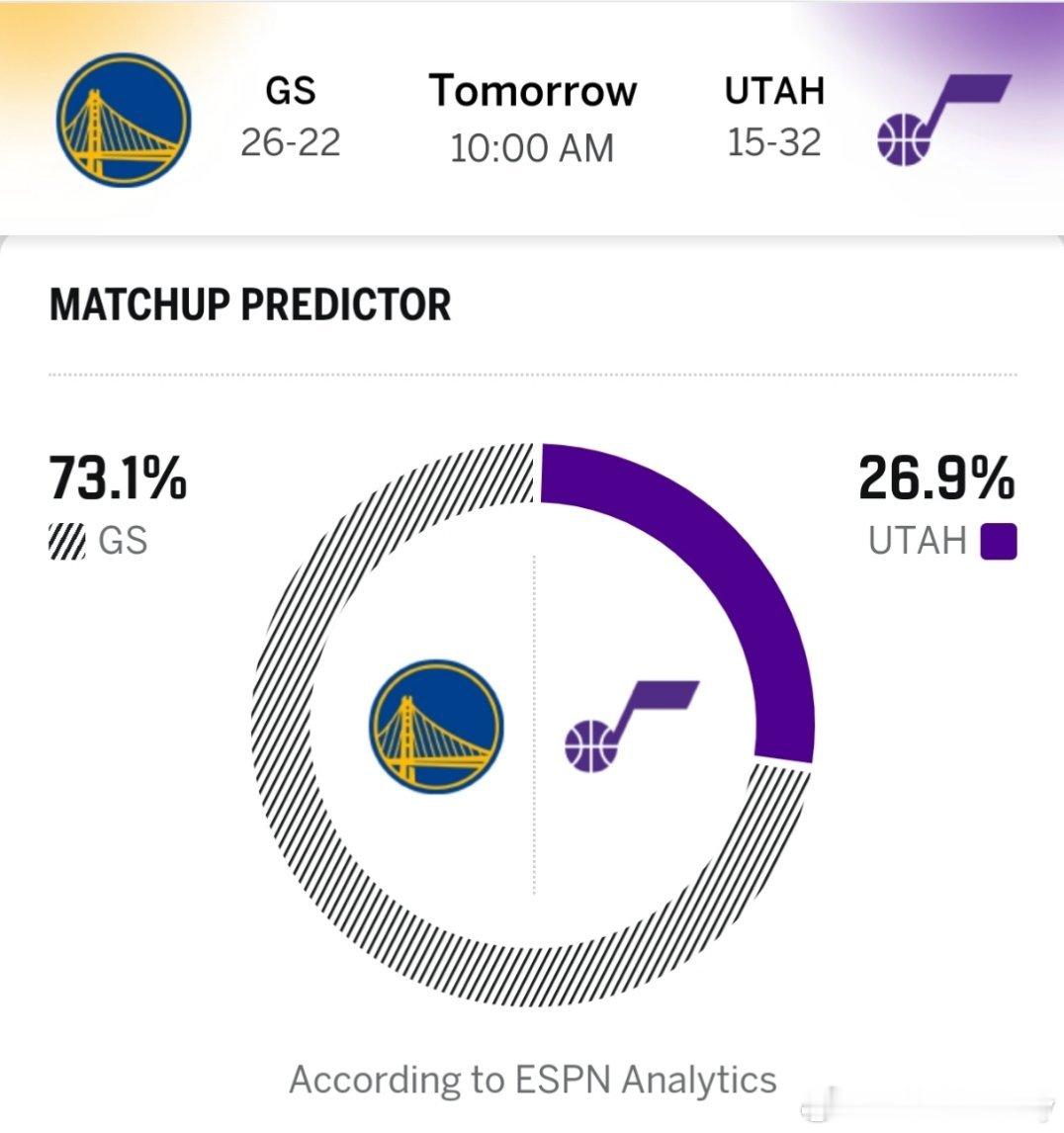 比赛预告:明天上午10:00,勇士四连客最后一场,对手爵士。后者3连败,且背靠背。勇士伤病报告:库里、格林、小佩顿大概率出战,克赖尔出战成疑库明加、塞斯库里、巴特勒缺席爵士伤病报告:基昂特乔治、努尔基奇、哈克莱斯出战成疑,尼昂、凯斯勒缺席ESPN预测双方胜率:勇士73.1%,爵士26.9%,勇士-10.5分