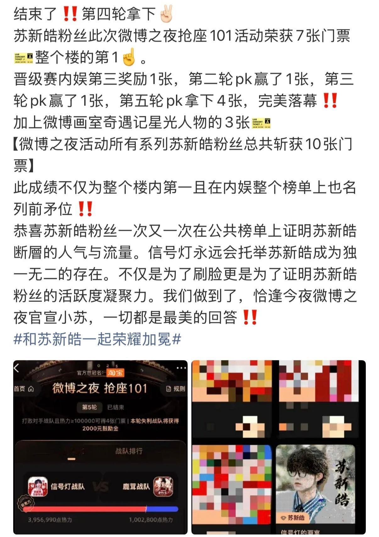 苏新皓家这次微博之夜战队101参加的真值啊,获得了7张票不说,内娱很多家都眼熟了小孩和小孩粉丝,有和内娱前辈拼一拼的勇气和实力,确定是人气大top