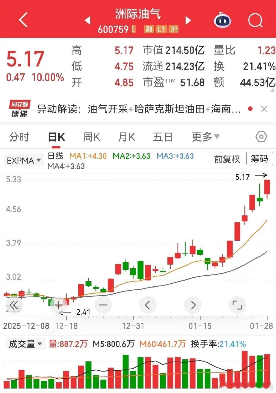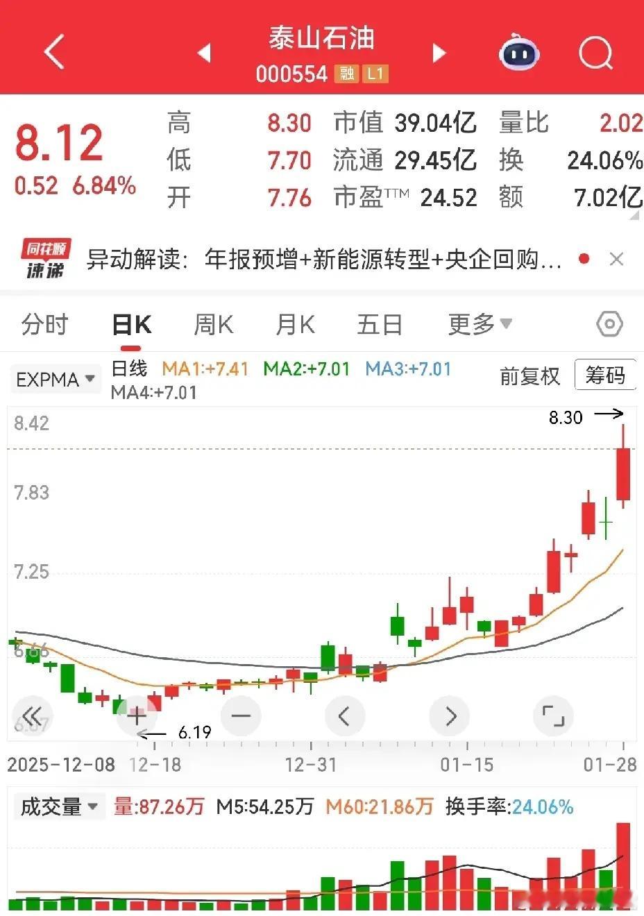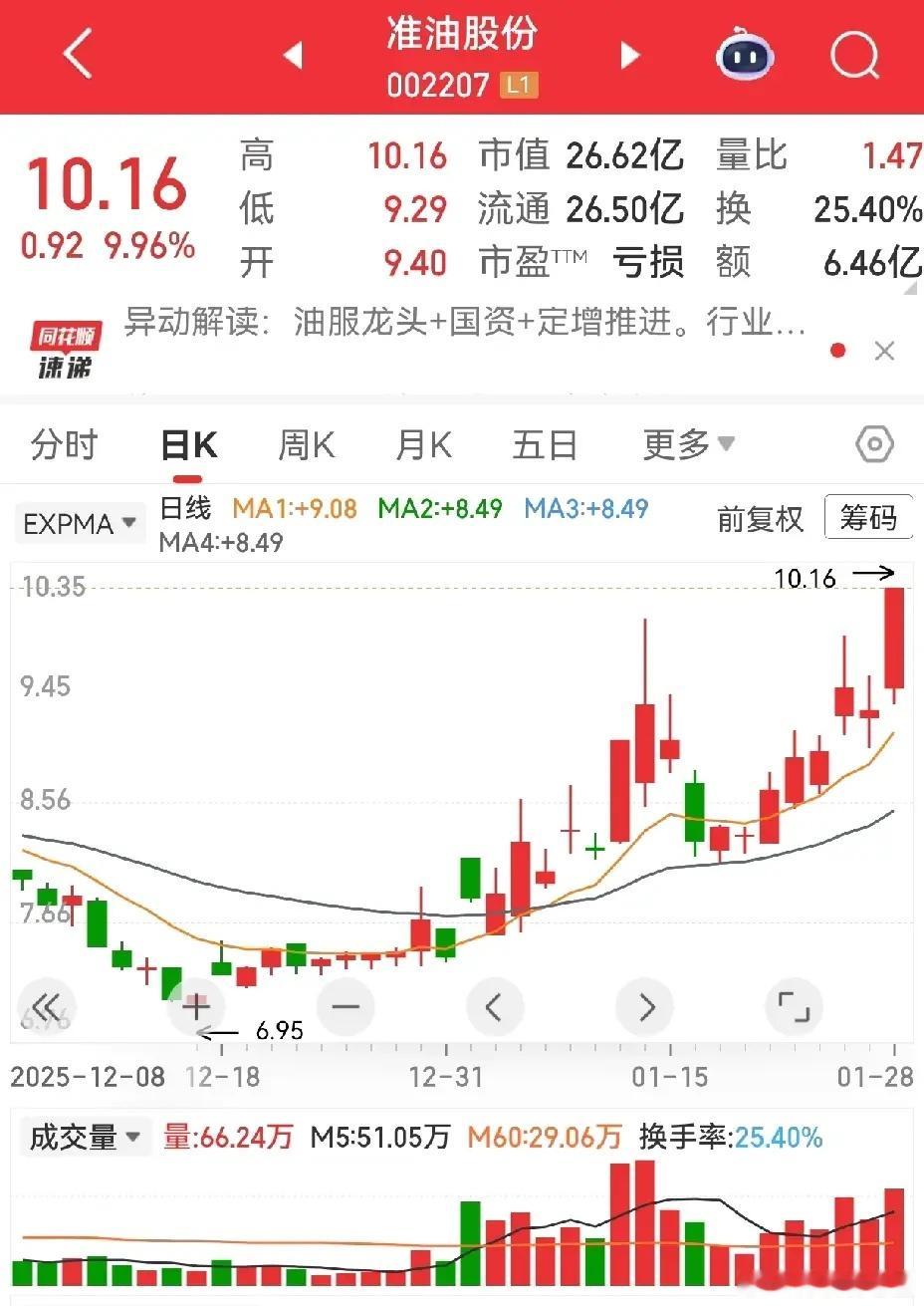 国际大环境加持下,油气油服这条资源线彻底走热,板块轮番走强太亮眼了!回头看洲际油气真的太稳了,当初才两三块的价格,如今直冲5.17元,六天四板的走势,拿住的朋友妥妥吃大肉!低价标的石化油服也超给力,不到三块的价格今日强势涨停,资金认可度拉满准油股份也紧跟步伐封板,倒是原本看好的山东墨龙今日稍显平淡,板块轮动里总有小意外。贝肯能源的八连阳更是亮眼,一路走高的节奏,反倒有点好奇啥时候来根阴线洗洗盘 还有泰山石油,年报预增叠加新能源转型,基本面在线,就等一波回调择机布局,耐心蹲个好机会。油气油服的行情还在发酵,跟着板块节奏走,低吸不追高,稳稳把握才是王道。