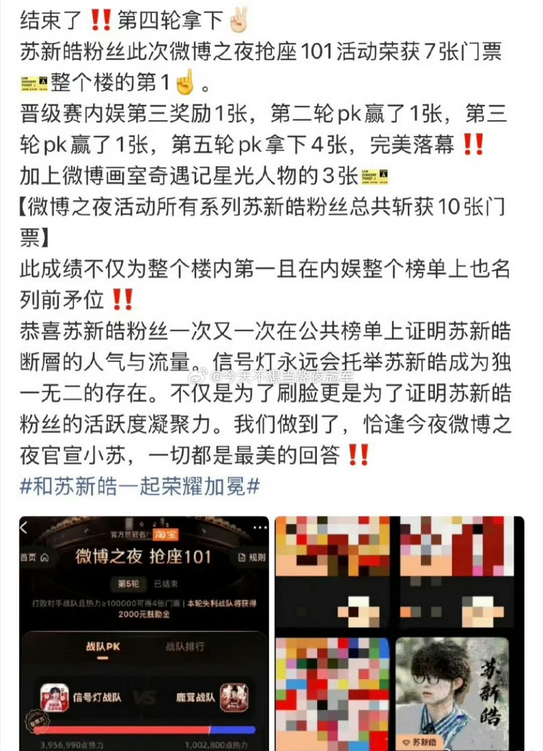 苏新皓微博之夜抢座拿了7张🎫,截止目前一共拿下10张🎫,是楼内数量最多的。