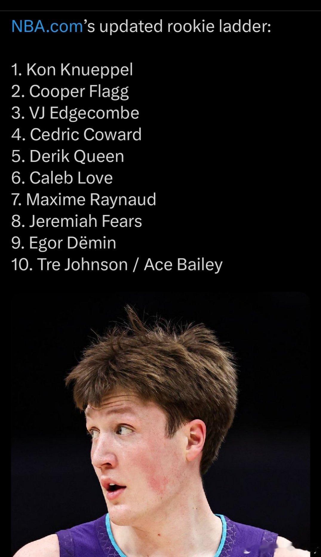 NBA官方公布最新一期新秀排名:1. 康·克尼佩尔2. 库珀·弗拉格3. VJ·埃奇科姆4. 塞德里克·考沃德5. 德里克·奎因6. 卡莱布·洛夫7. 马克西姆·雷诺8. 杰里迈亚·菲尔斯9. 伊戈尔·德明10. 特雷·约翰逊/艾斯·贝利