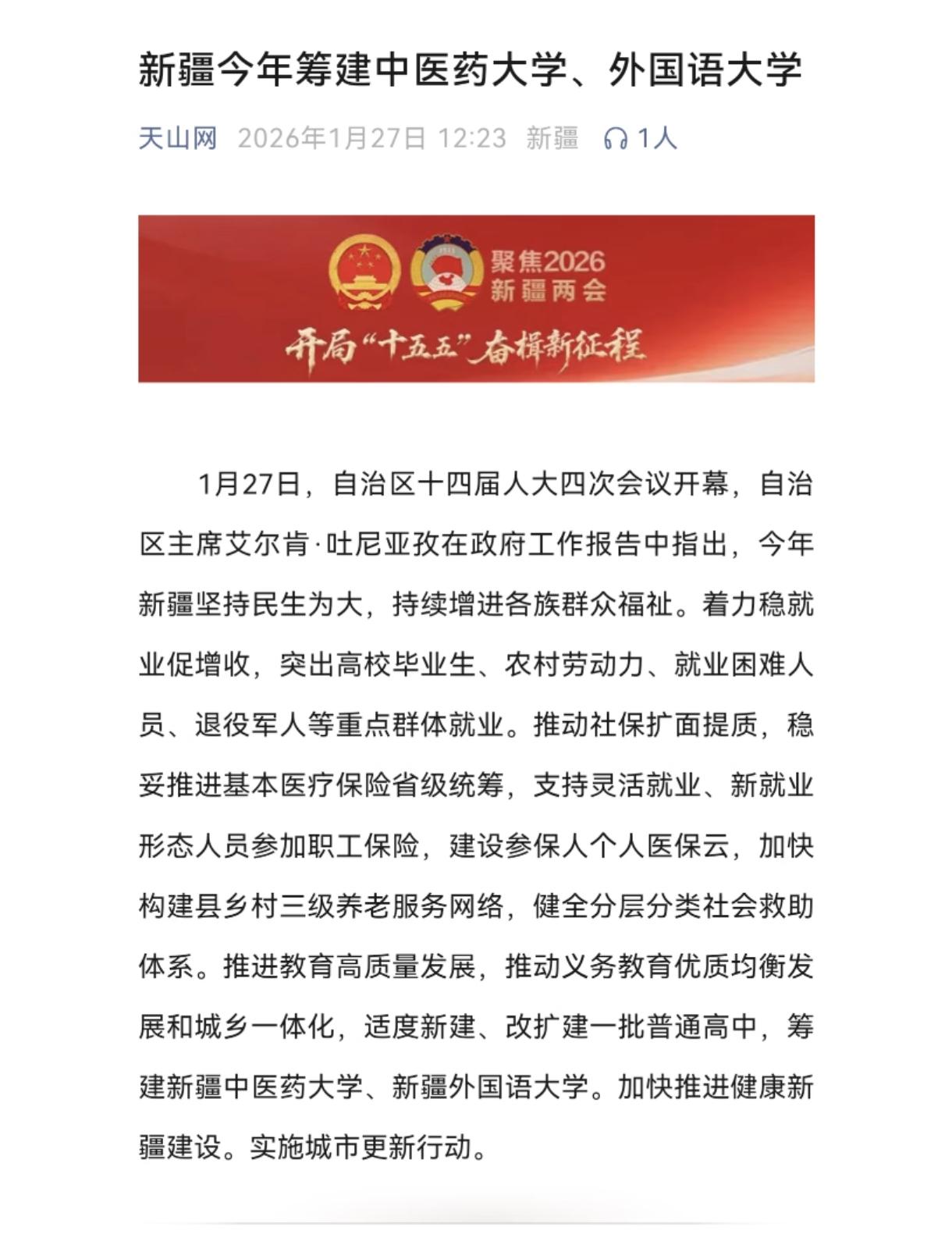 这个省要新建中医药大学和外国语大学!这个地方不是东部某市,也不是中部某省,而是地处西北的大美新疆。 新疆自治区要新建中医药大学和外国语大学了,这是该地政府工作报告中新提出的。 计划中的新疆中医药大学其实就是从新疆医科大学的中医学院分出来的,听新疆同事(家属是学校老师)讲最早计划建在雪莲山旁边那个空地,但现在好像是准备建在南疆了。有知道更多内情的,请说一说。 至于外国语大学,那真的是要新建了,难道是新疆大学外国语学院独立出来? 有人说,中医药和外国语都是红海了,中医虽然国家倡导但就业并不好,尤其外国语多难就业啊,不如建个体育大学。新疆体育可以的,还缺个专门的体育大学。 你们说呢?