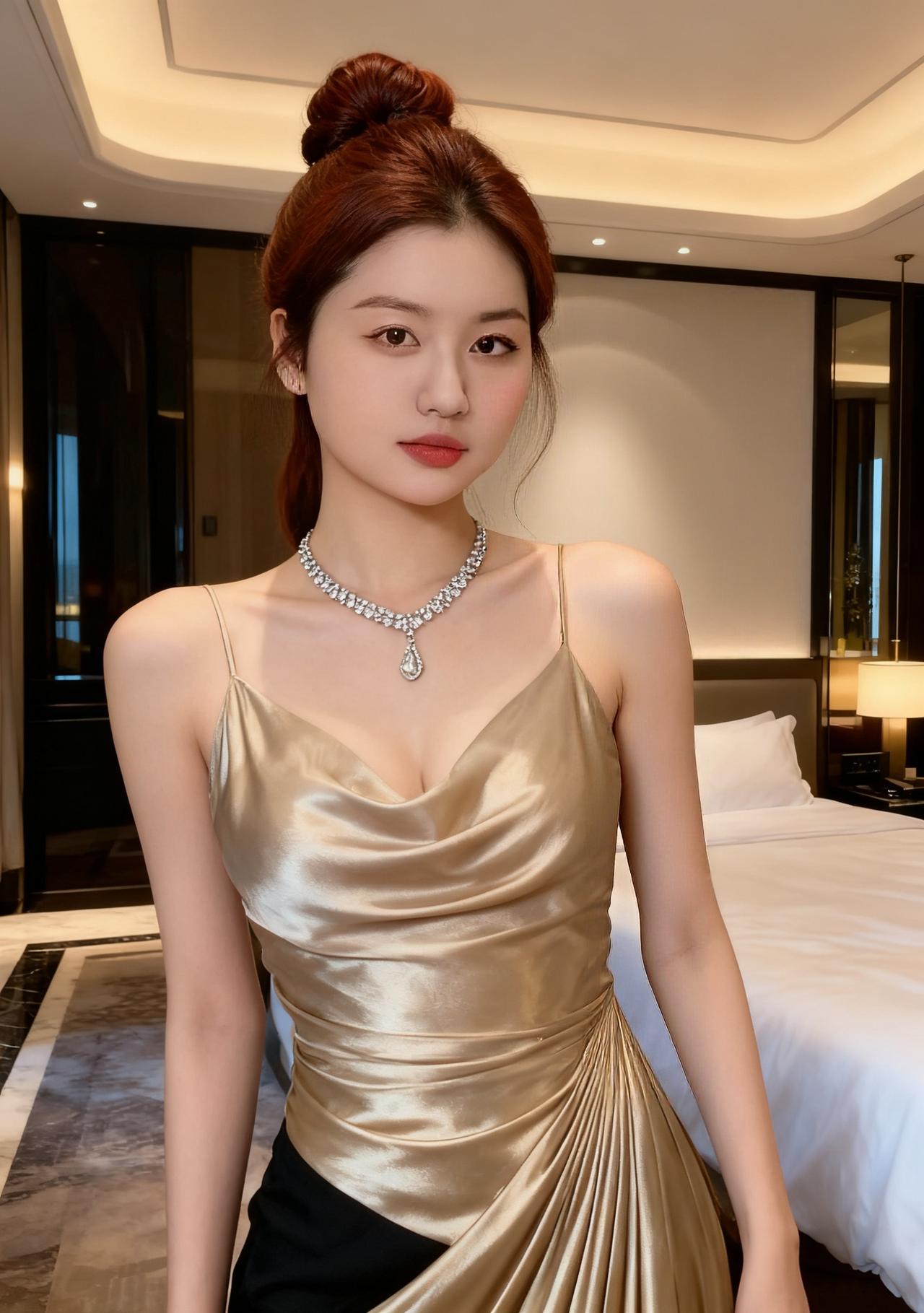 她身着一袭香槟金色吊带礼服裙,面料自带细腻光泽感,整体造型优雅又不失灵动,尽显精致贵气。