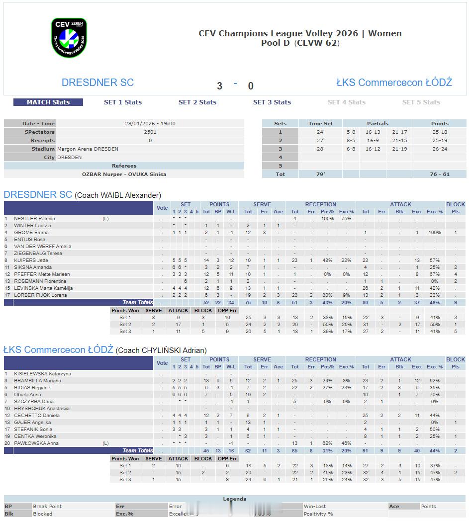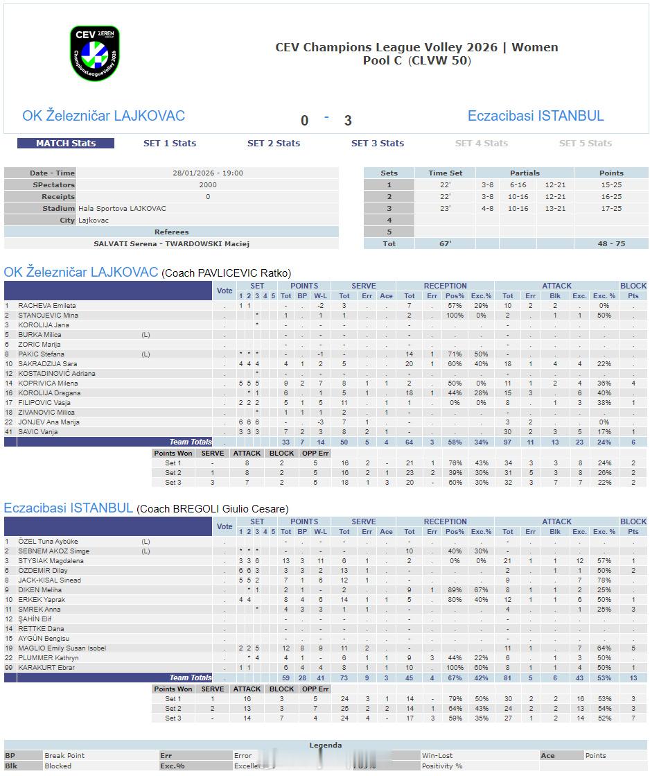 【欧冠女排伊萨屠戮铁路工人 什未林2-3败走巴黎】国际排坛战报速递1月28日,欧冠女排第四轮第五回合,C组土耳其伊萨奇巴希客场砍瓜切菜,3-0(25-15/25-16/25-17)轻取塞尔维亚铁路工人,斯蒂西亚克13分、马格里奥12分、奥兹德米尔3分荣膺MVP,科普里维卡得到主队最高的9分。E组德国什未林败走麦城,客场2-3(25-21/27-25/23-25/21-25/9-15)惨遭法国巴黎大逆转。科克18分、霍尔齐格14分、滕布林克13分、斯图特和阿蒂休克各11分,布科夫斯卡25分、MVP米洛西奇21分、贝尔托利诺14分、波尔德11分;D组德国德累斯顿主场3-0(25-18/25-19/26-24)波兰罗兹LKS,MVP库伊佩尔斯14分、普菲尔和列文斯卡各12分,布拉姆比拉13分、塞切托12分。